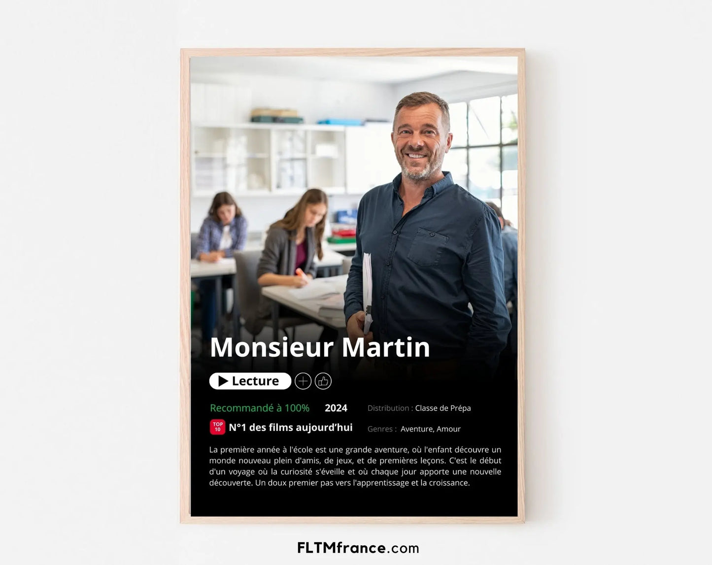 Affiche Netflix maître personnalisée : Une affiche personnalisée pour un maître d'école, le représentant comme un acteur principal d'une série Netflix éducative. Un excellent cadeau de fin d'année scolaire.