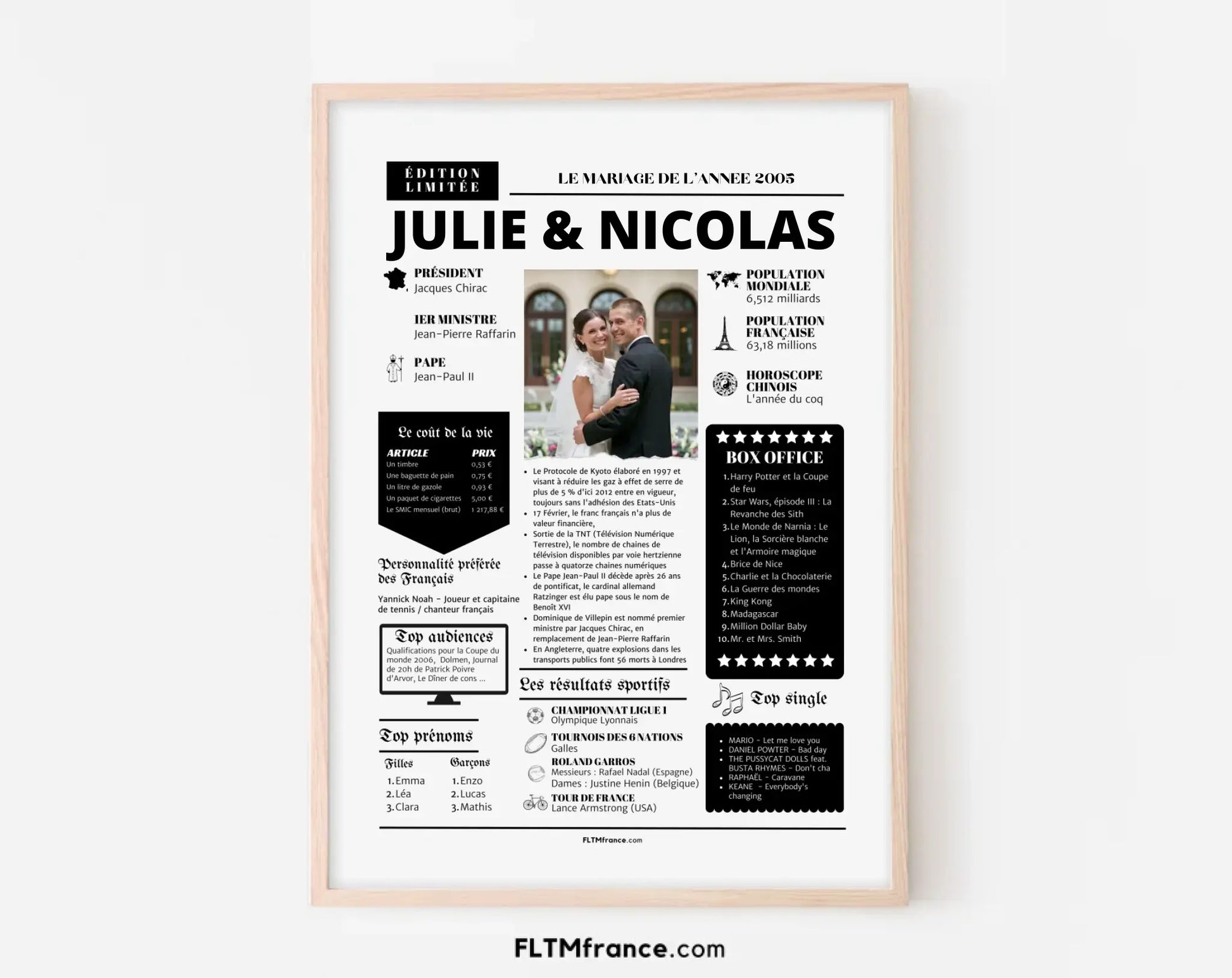 Célébrez 20 ans d’amour et de complicité avec une affiche rétro et personnalisée à imprimer ! Parfaite pour fêter vos noces de porcelaine, cette affiche au format journal de l’année revient sur les moments forts de votre année de mariage. Un souvenir unique et plein de charme à offrir ou à s’offrir !