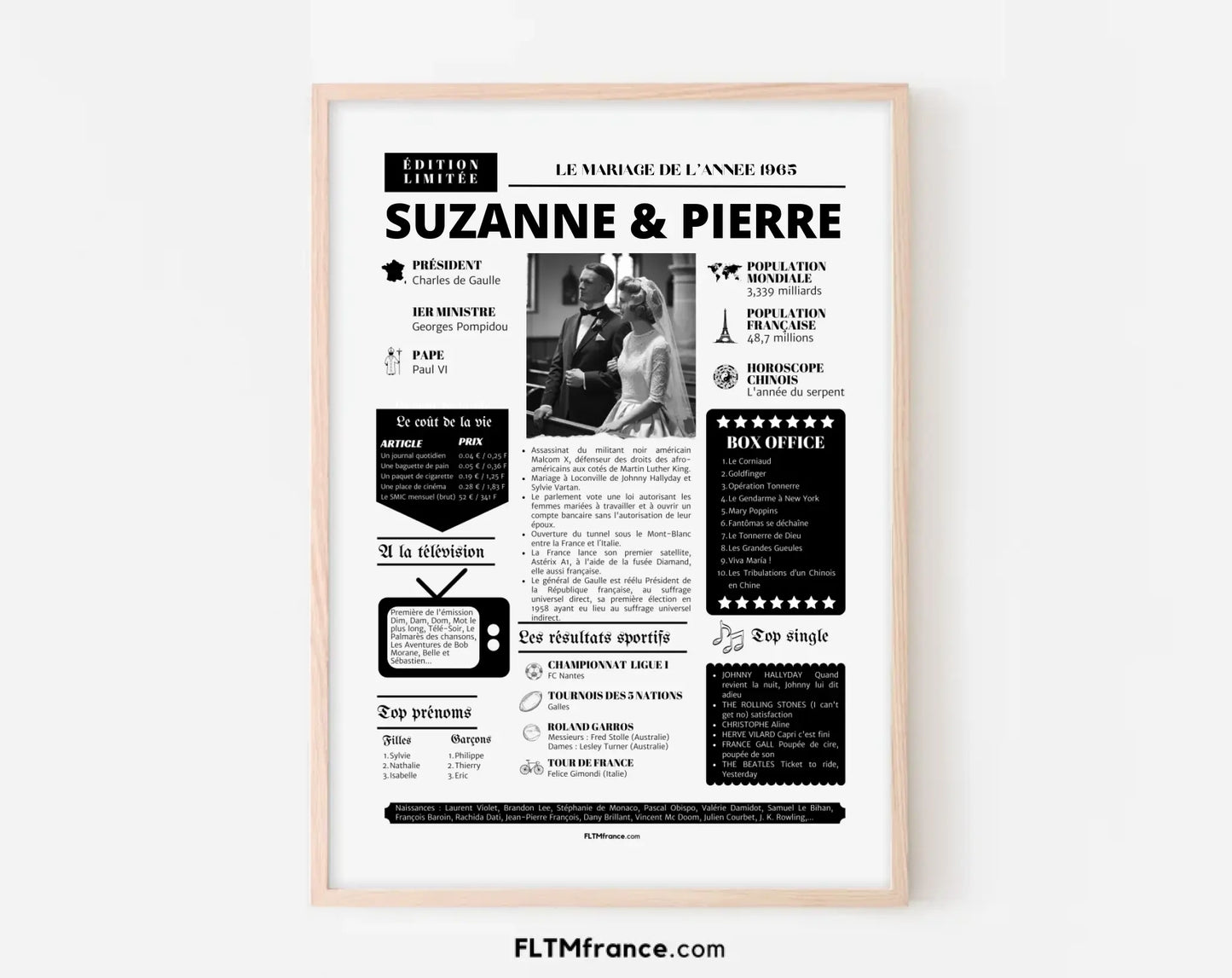 60 ans de mariage, c’est une vie d’amour, de souvenirs et de fidélité à célébrer avec émotion. Cette affiche personnalisée façon journal de l’année est un hommage unique au couple et à leur parcours. Une création à la fois touchante, élégante et pleine d’histoire, parfaite pour fêter des noces de diamant.