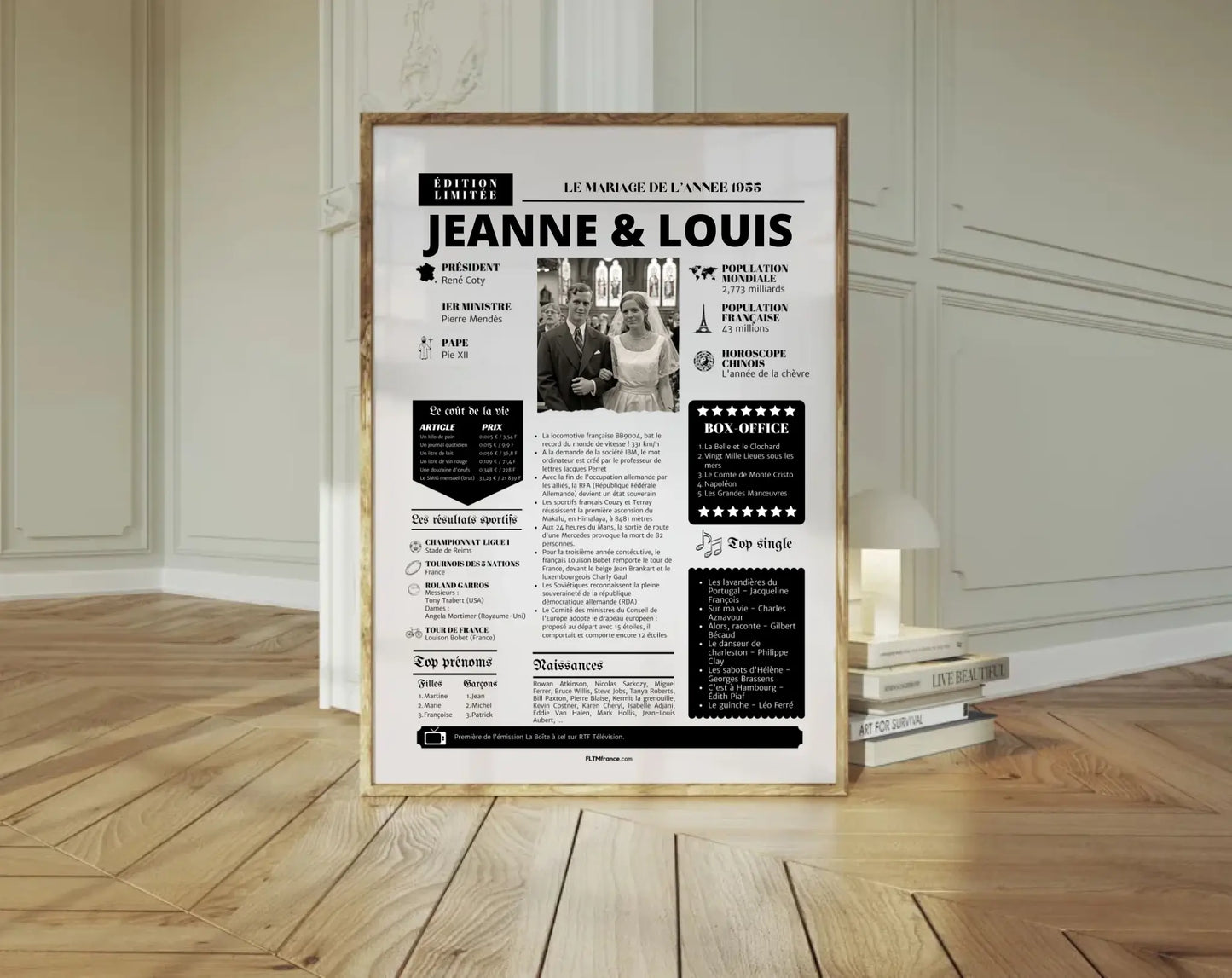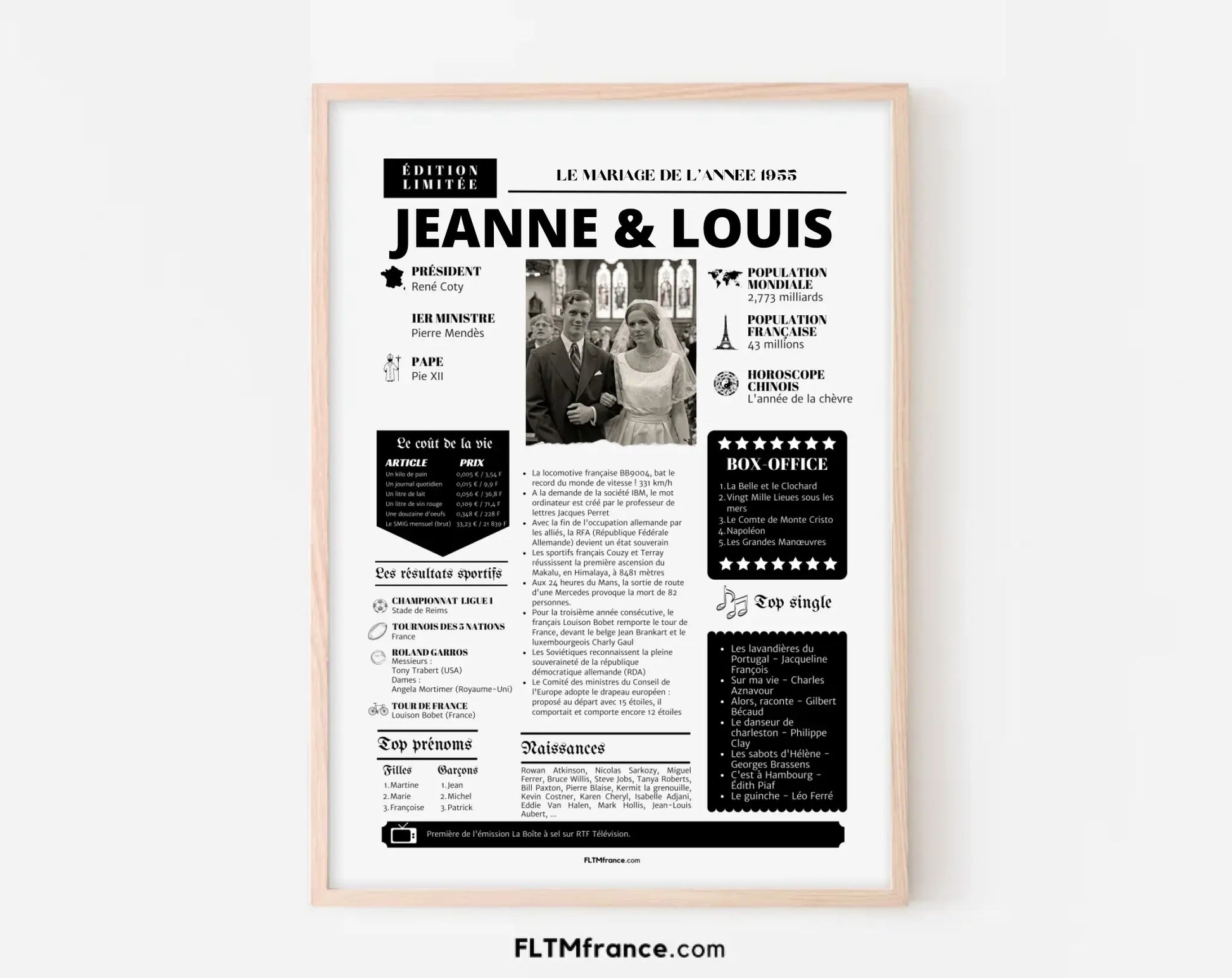 70 ans de mariage, c’est l’exception, la rareté, la beauté d’un amour qui dure toute une vie. Pour célébrer cet événement extraordinaire, cette affiche personnalisée façon journal de l’année rend hommage à l’année de leur union. Un cadeau précieux, unique et émouvant, parfait pour des noces de platine.