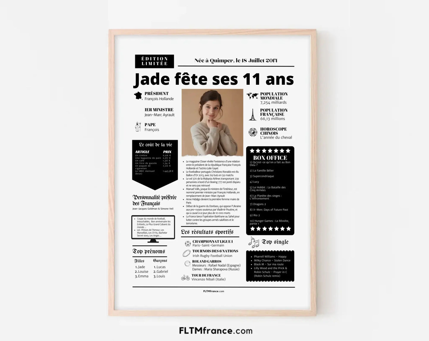 Cette affiche personnalisée des 11 ans est bien plus qu’un objet déco : c’est une capsule temporelle qui plonge ton enfant dans l’univers de son année de naissance – 2014. Une idée cadeau aussi belle que symbolique, à commander dès maintenant sur FLTMfrance.com.