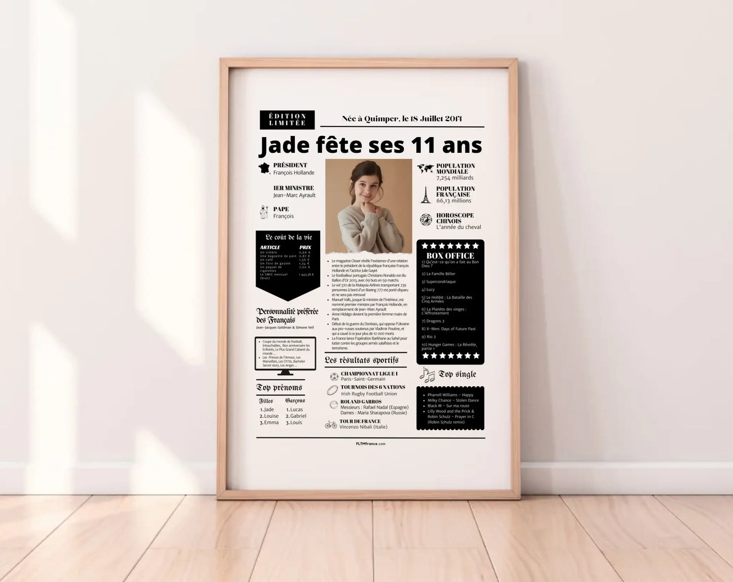Offre un cadeau unique et plein d’émotion avec cette affiche rétro anniversaire personnalisée ! Conçue comme un journal de l’année, elle met à l’honneur l’année 2014, l’année de naissance de ton enfant. Une surprise originale à encadrer pour une fête de ses 11 ans mémorable !