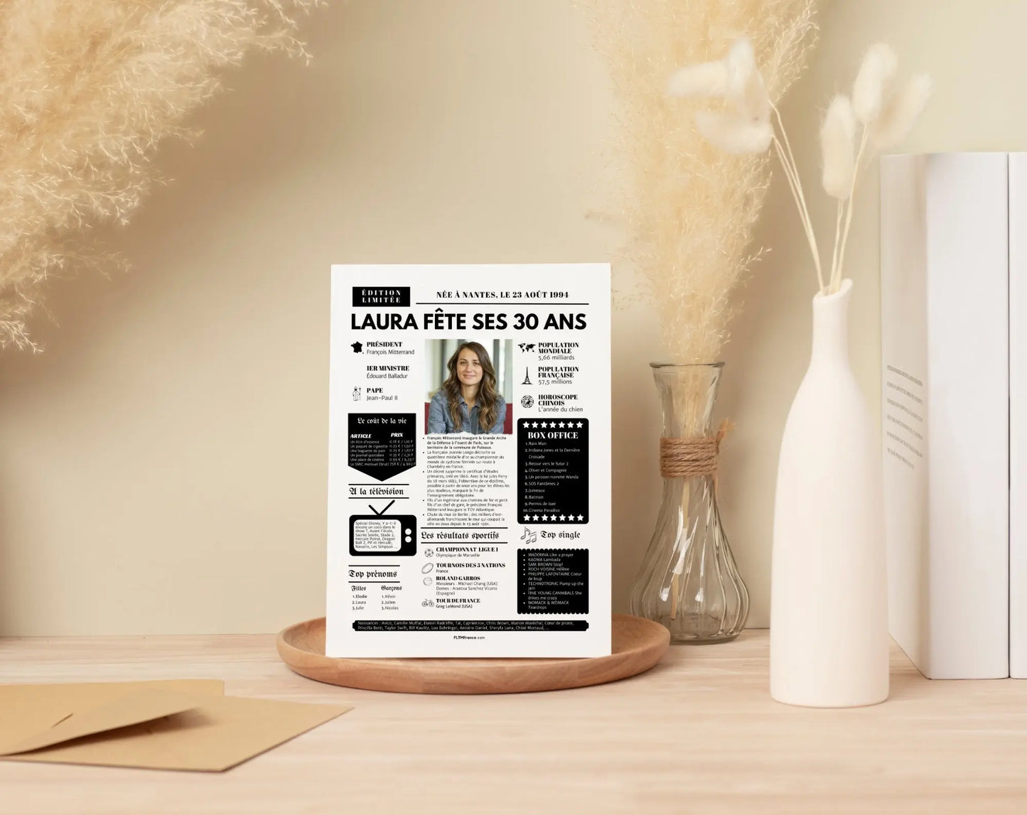 Marquez le passage symbolique à la trentaine avec notre affiche personnalisée anniversaire 30 ans. Une création élégante qui met en valeur l’année de naissance, accompagnée d’un design rétro et moderne à la fois. Personnalisez l’affiche avec un prénom, une date spéciale ou un message inspirant, et même ajoutez une photo, pour offrir un souvenir unique et mémorable.