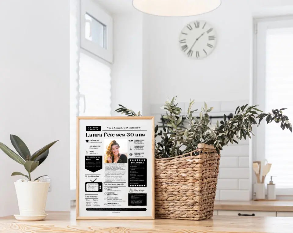 L’affiche personnalisée anniversaire 30 ans - Année de naissance est la solution idéale pour marquer ce moment important de manière unique et élégante. Grâce à sa personnalisation complète et à son design soigné, elle constitue un cadeau mémorable ou une décoration élégante pour célébrer les 30 ans en beauté.