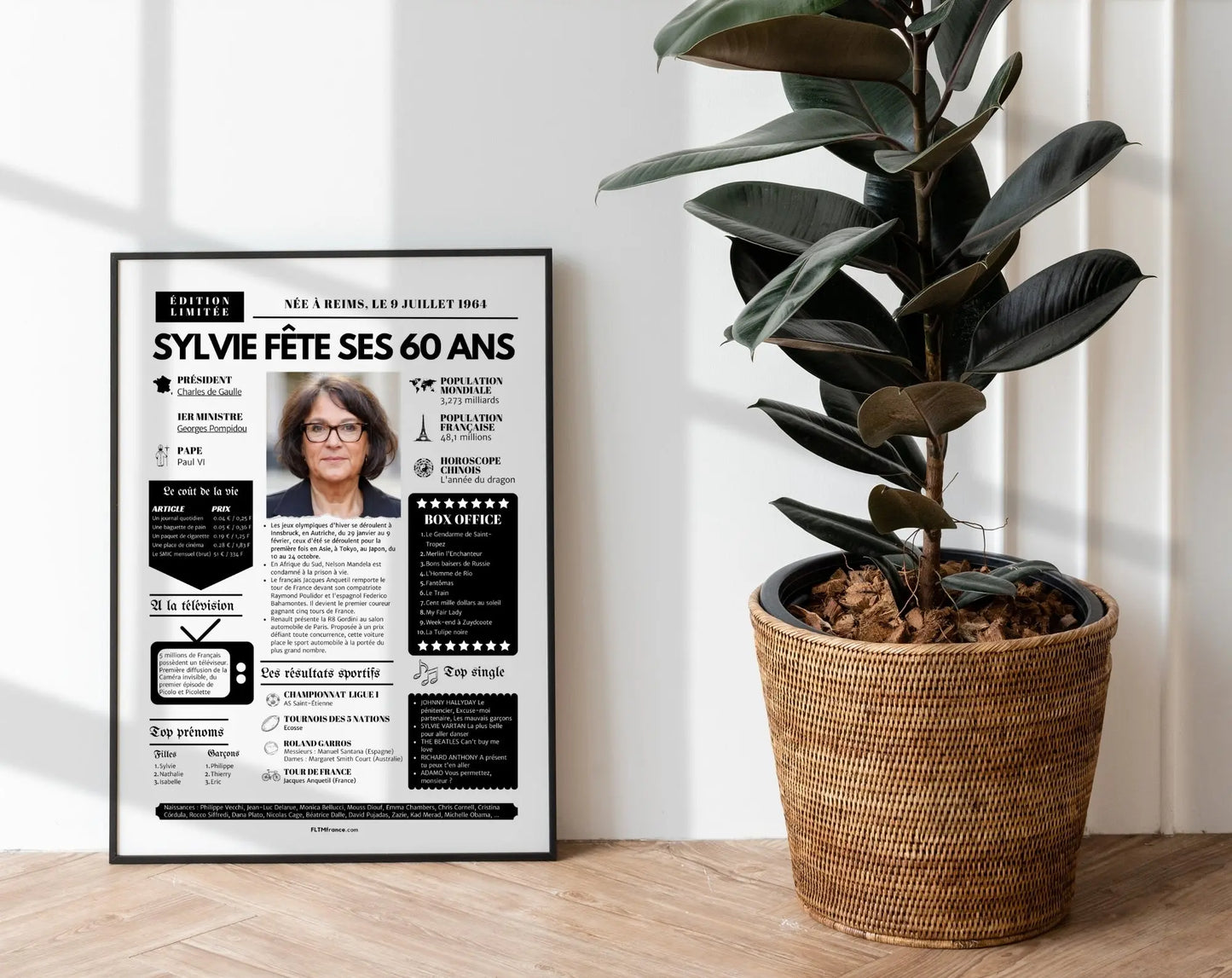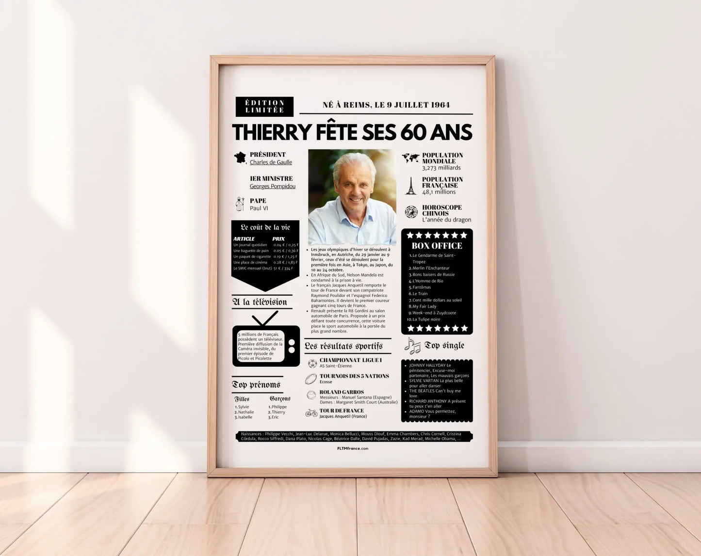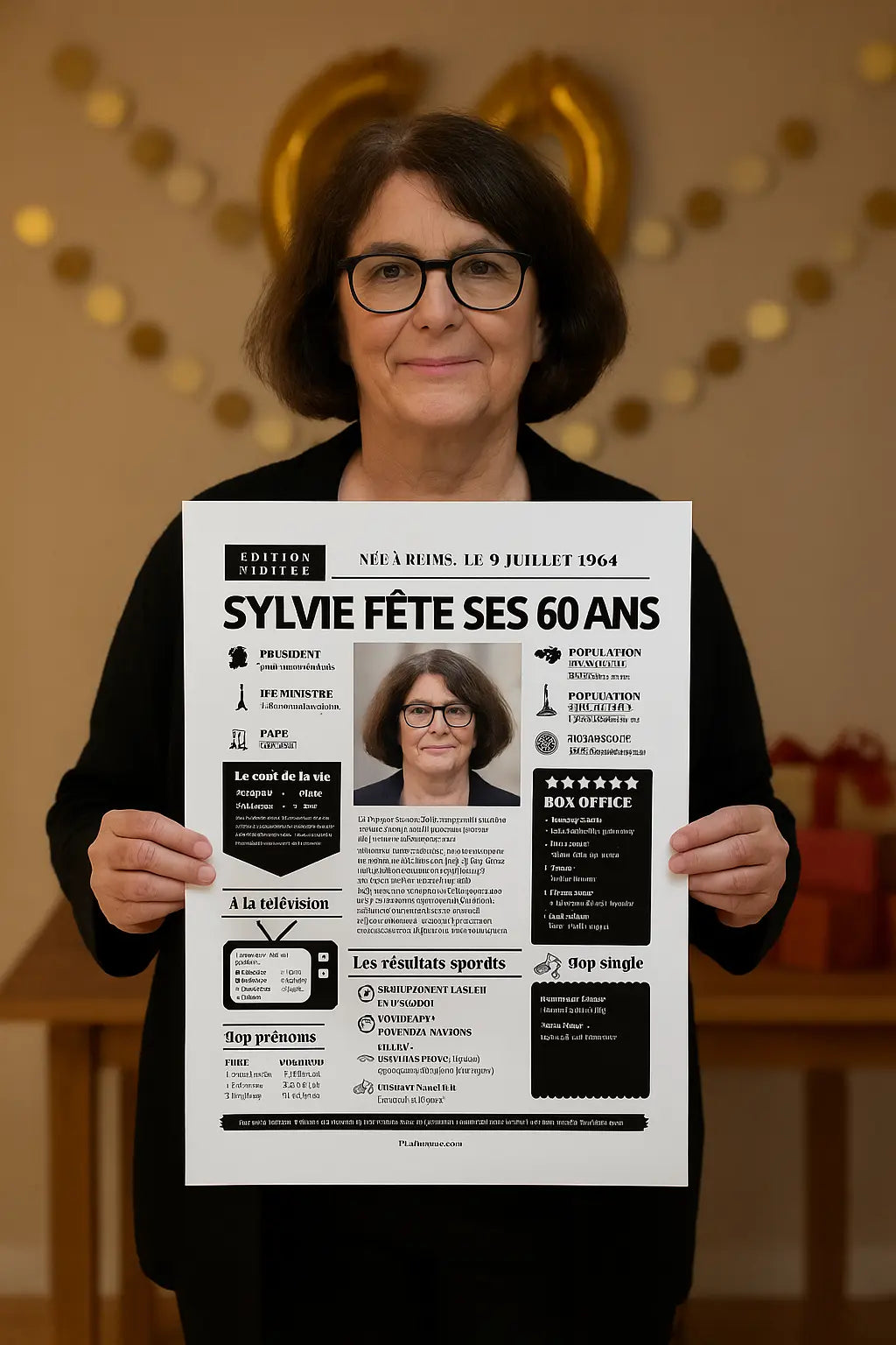 Offre un cadeau inoubliable pour les 60 ans avec cette affiche personnalisée façon une de journal rétro ! Remplie de souvenirs, de faits marquants, de chiffres insolites et de moments cultes, elle replonge le ou la destinataire dans l’année de sa naissance, avec une touche d’humour et beaucoup d’émotion.