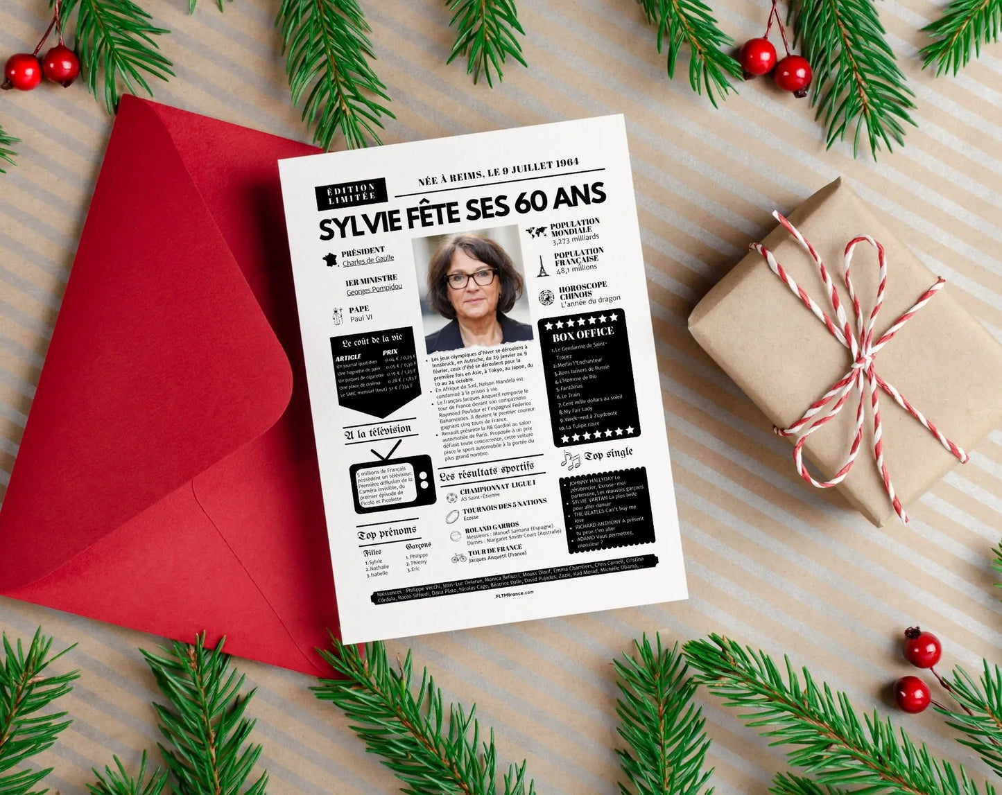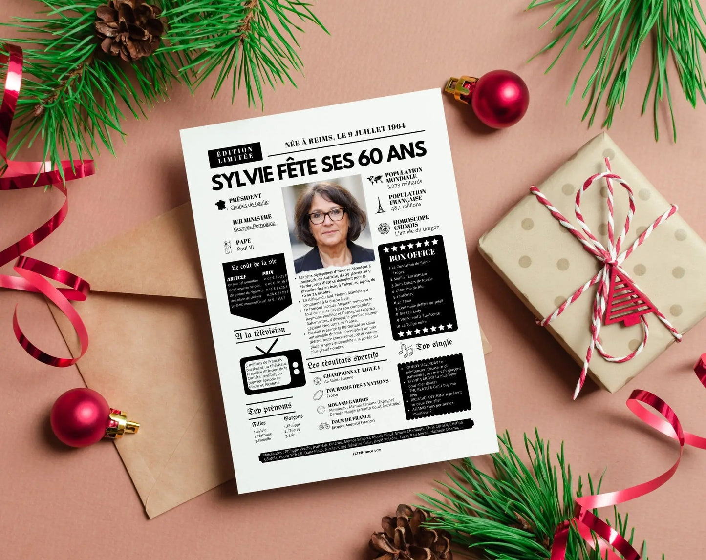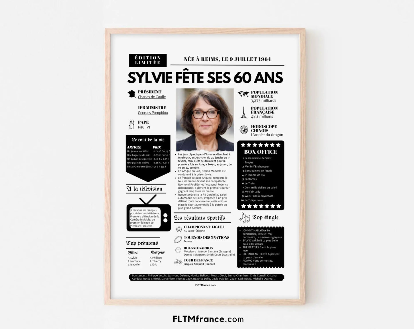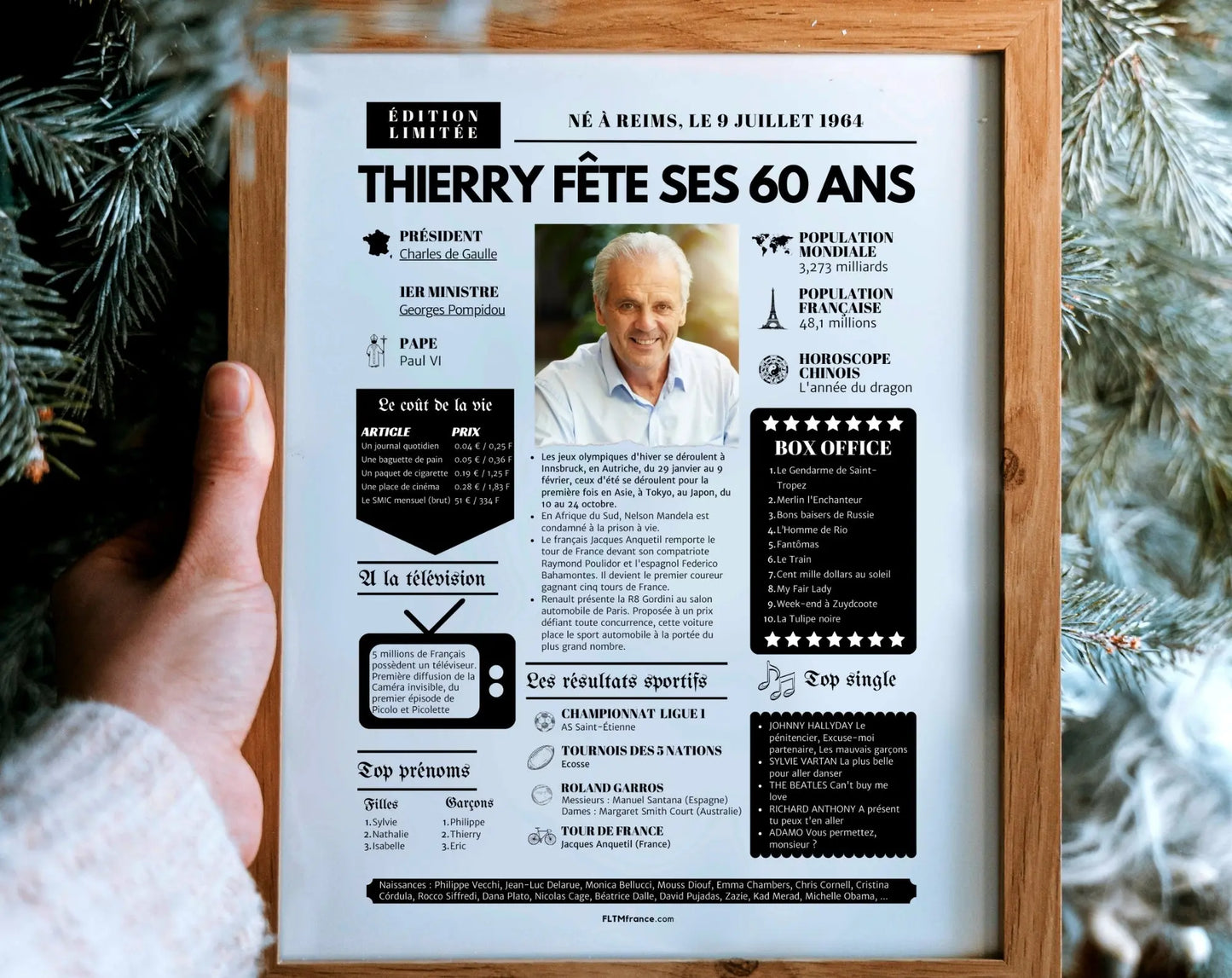 Offre un cadeau inoubliable pour les 60 ans avec cette affiche personnalisée façon une de journal rétro ! Remplie de souvenirs, de faits marquants, de chiffres insolites et de moments cultes, elle replonge le ou la destinataire dans l’année de sa naissance, avec une touche d’humour et beaucoup d’émotion.