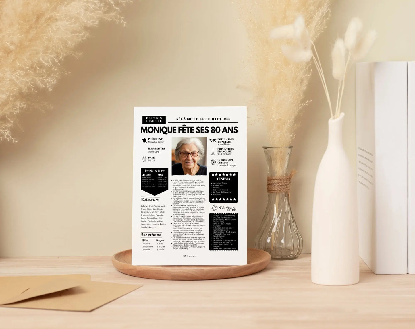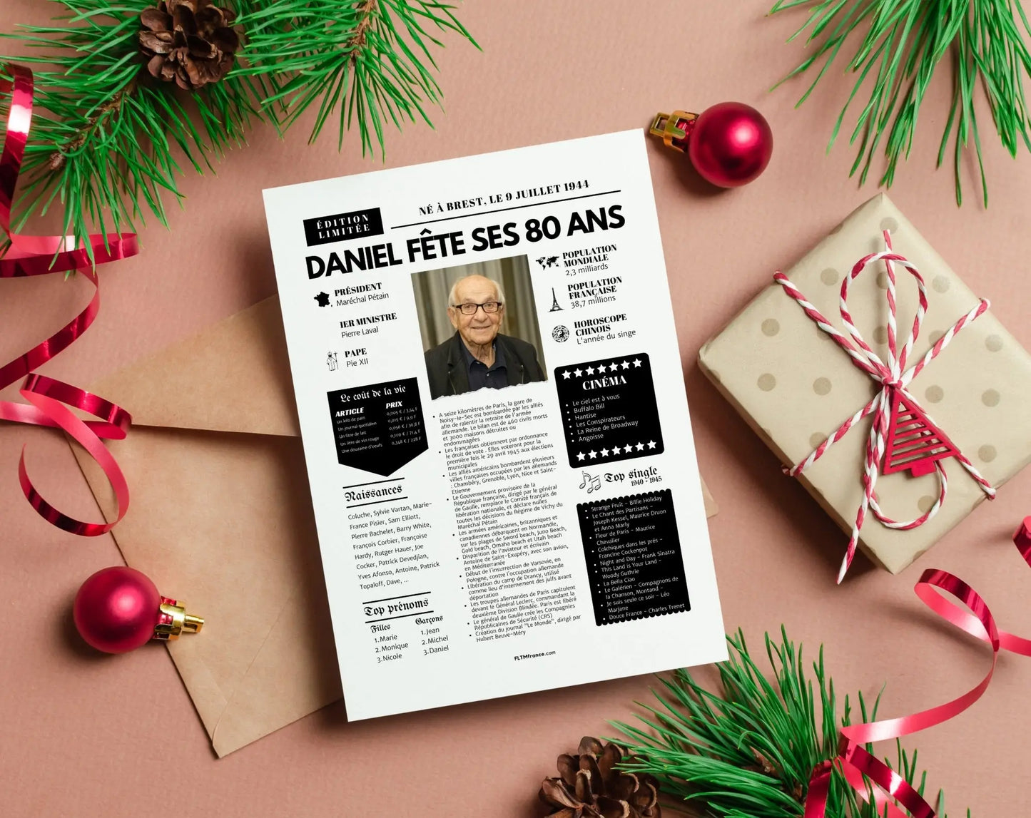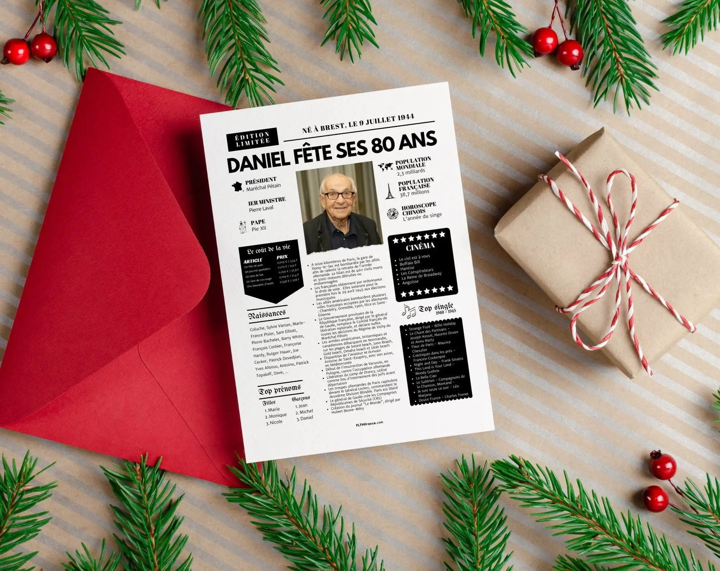 Offre un cadeau personnalisé et touchant qui retrace les moments forts de l’année de naissance de la personne célébrée. Pour un anniversaire de 80 ans en 2025, cela correspond à l’année 1945 – une année historique à revivre à travers une mise en page façon journal vintage.