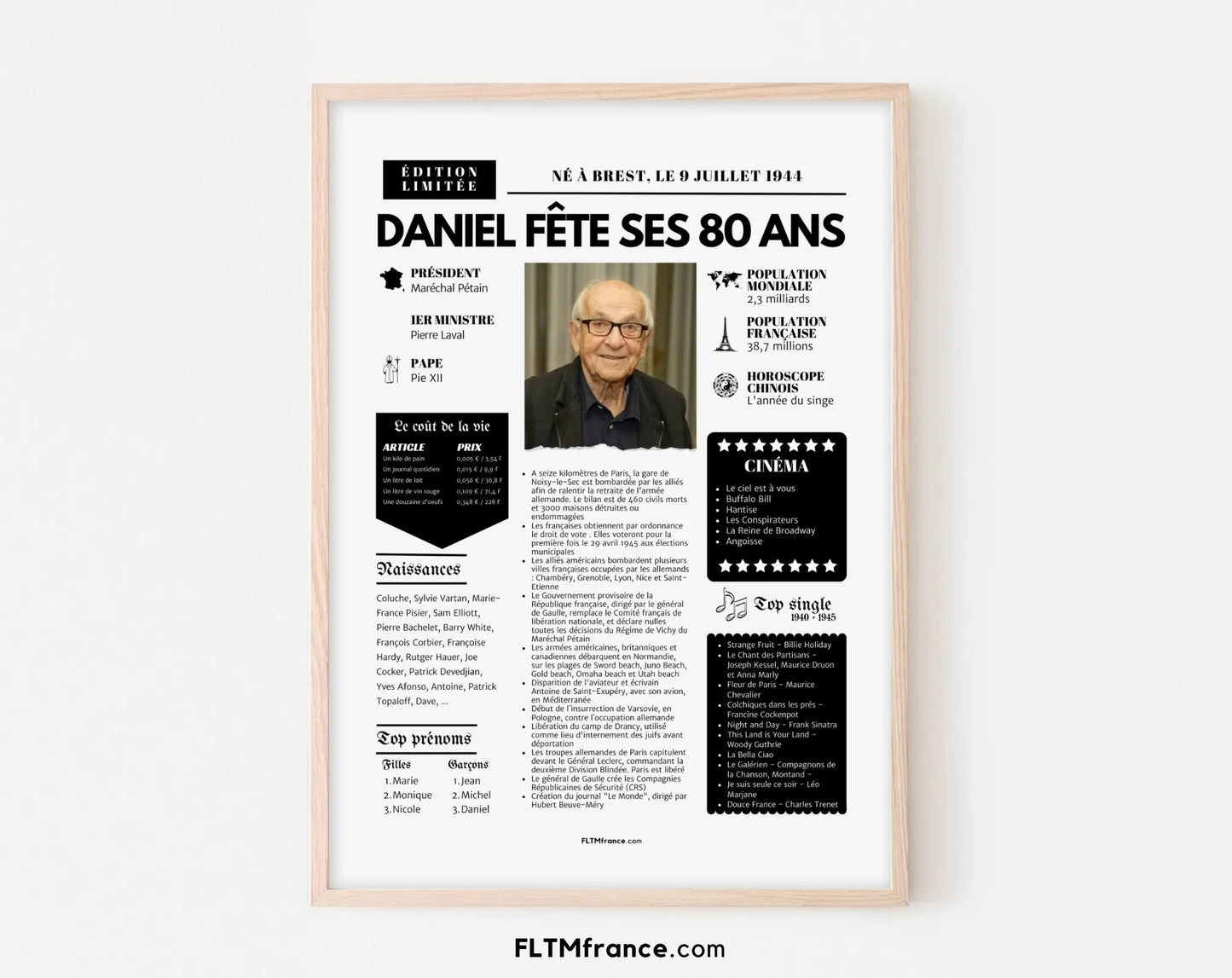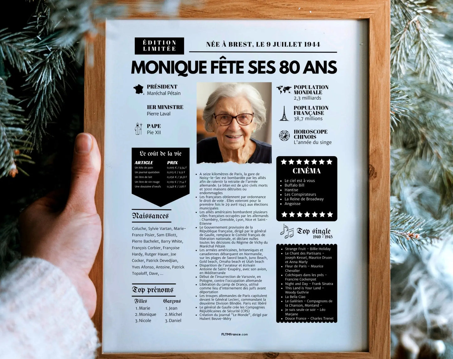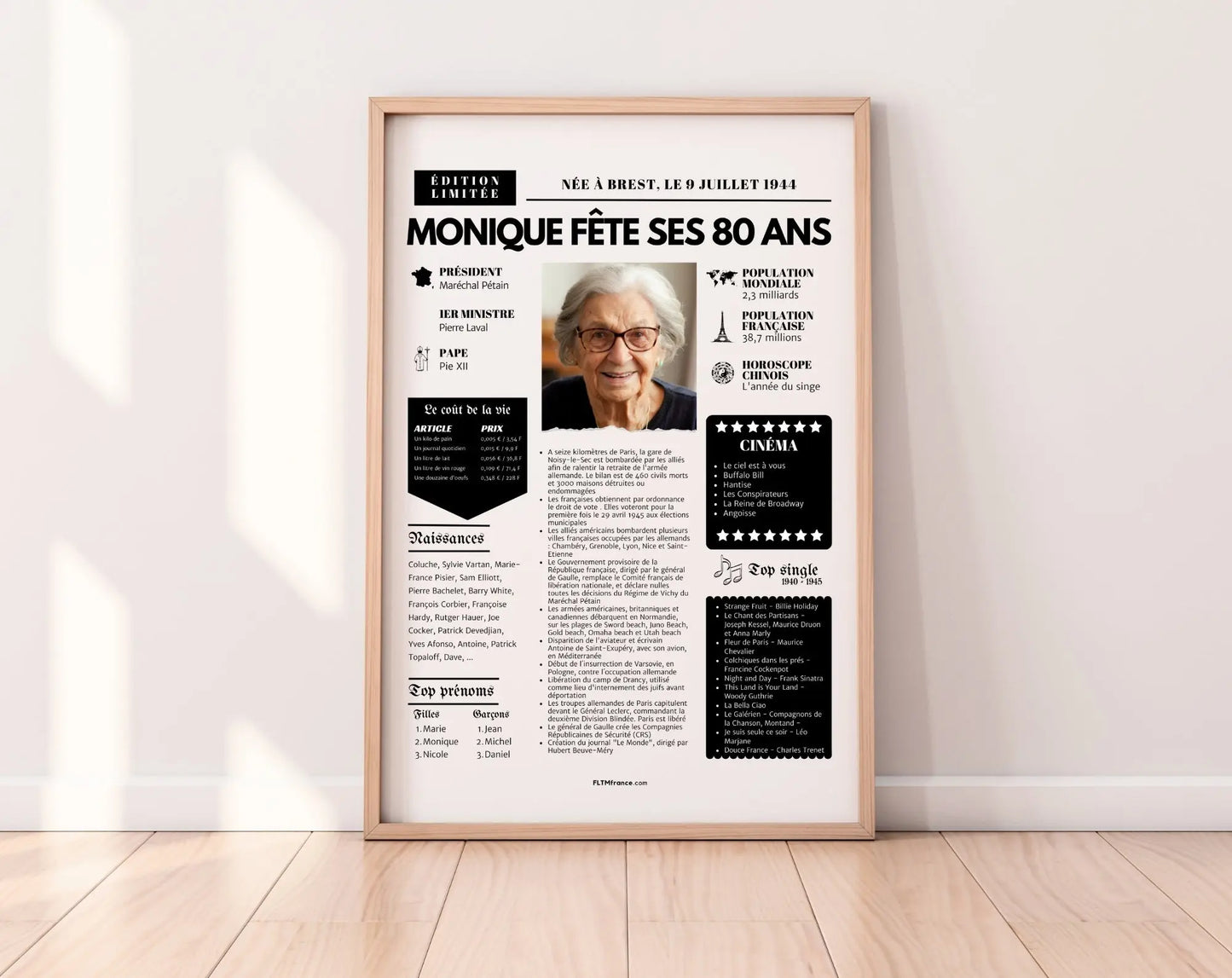 Offre un cadeau personnalisé et touchant qui retrace les moments forts de l’année de naissance de la personne célébrée. Pour un anniversaire de 80 ans en 2025, cela correspond à l’année 1945 – une année historique à revivre à travers une mise en page façon journal vintage.