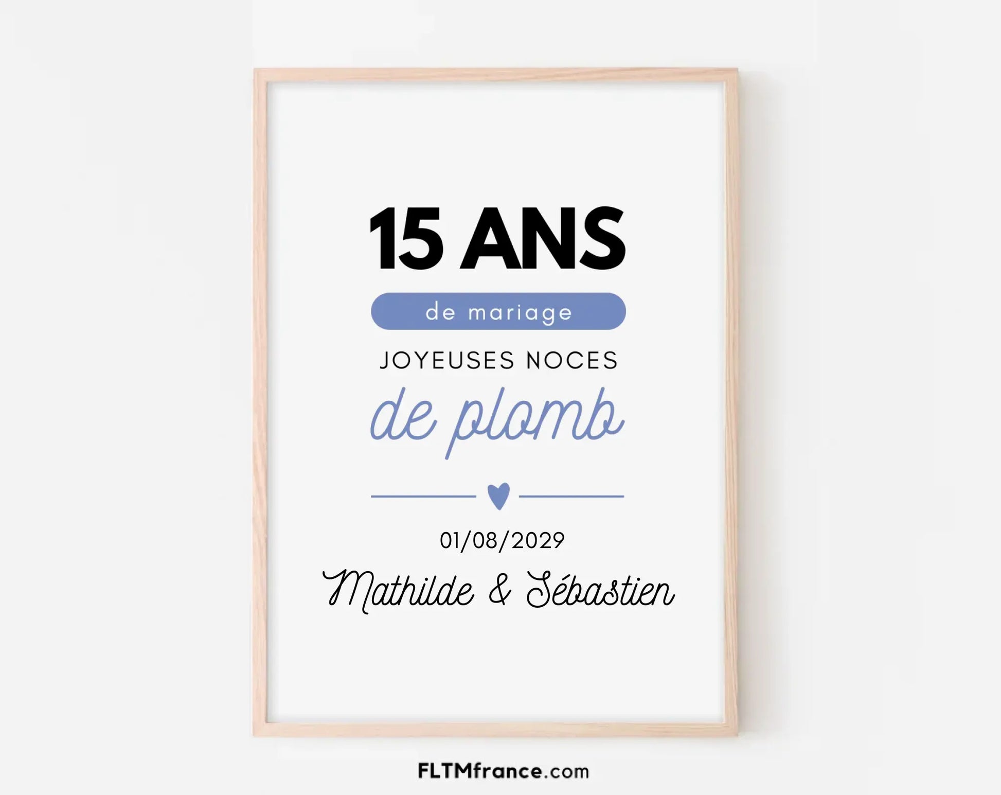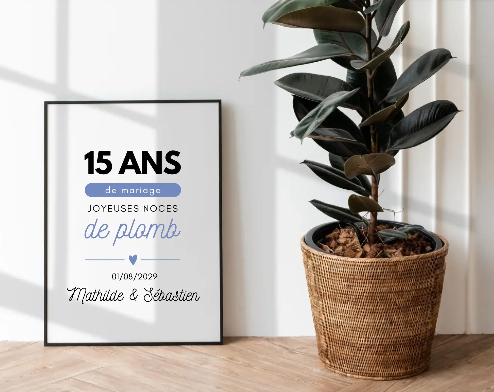 Déjà 15 ans de mariage ! Après toutes ces années à bâtir votre histoire, vous atteignez le cap prestigieux des Noces de cristal. Le cristal est symbole de pureté, de transparence et de solidité. Tout comme lui, votre amour reflète la lumière, capte chaque émotion et brille de mille éclats. Après 15 ans, votre couple est clair comme du cristal : sans fioriture, résistant mais raffiné, prêt à traverser encore de nombreuses années ensemble. Avec cette Affiche personnalisée « Joyeuses Noces de cristal », tu offres bien plus qu’un simple cadeau : un hommage à votre histoire, à afficher fièrement comme un bijou dans votre intérieur 💎✨