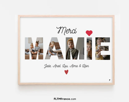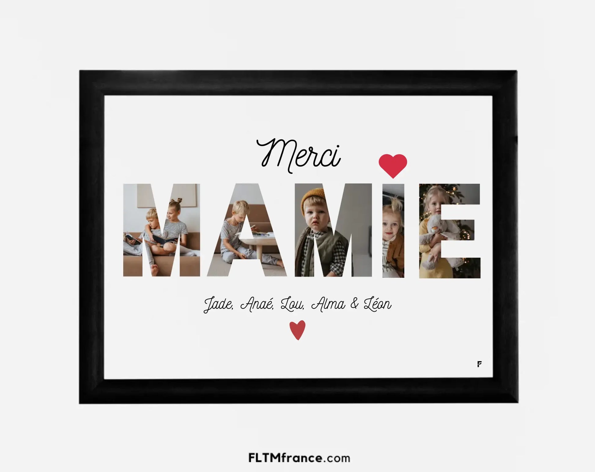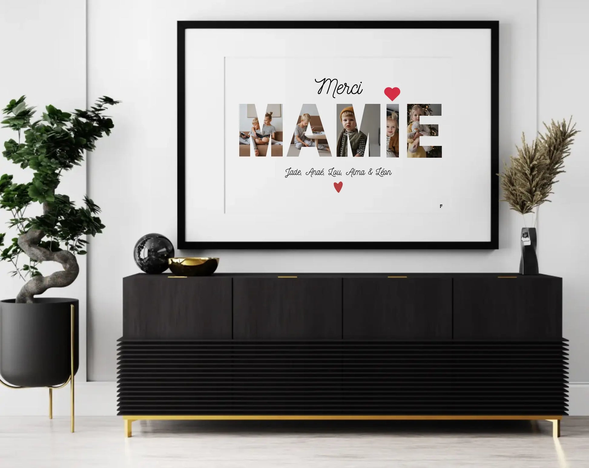 Avec son design élégant et moderne, cette affiche intègre les photos des petits-enfants à l’intérieur du mot MAMIE, sublimé par de petits cœurs pour une touche tendre et chaleureuse. Un cadeau unique et chargé d’émotion, idéal pour une mamie qui mérite tout l’amour du monde !