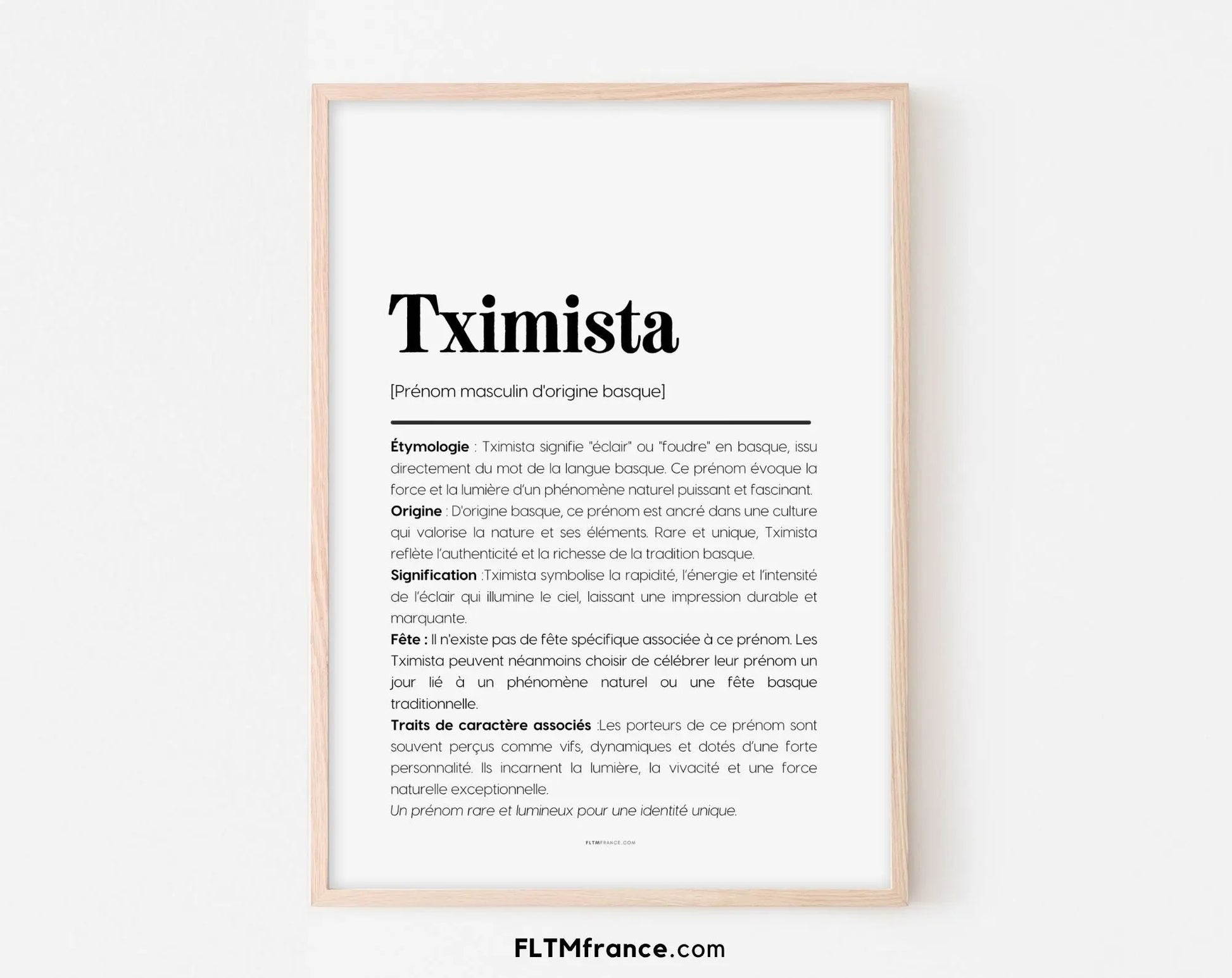 Télécharge et imprime chez toi cette affiche prénom Tximista, parfaite comme cadeau de naissance original, déco de chambre, ou souvenir marquant.