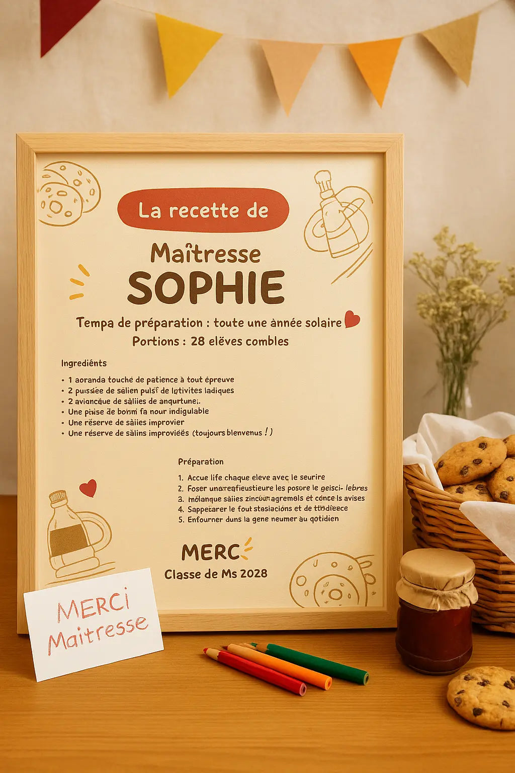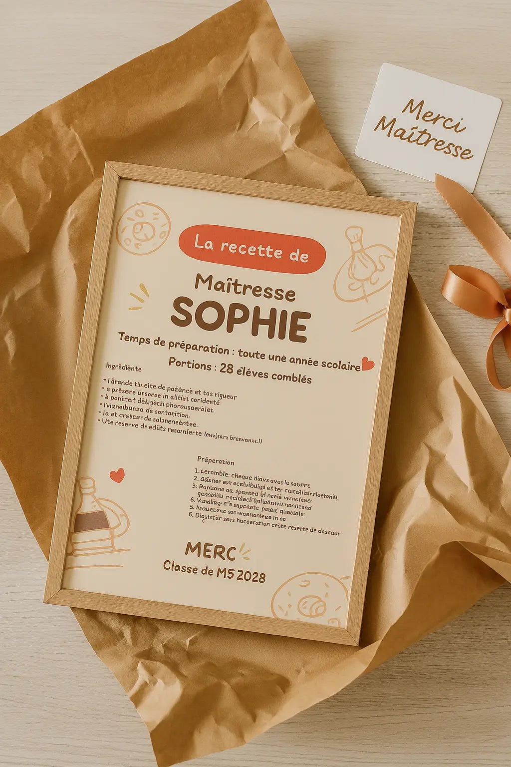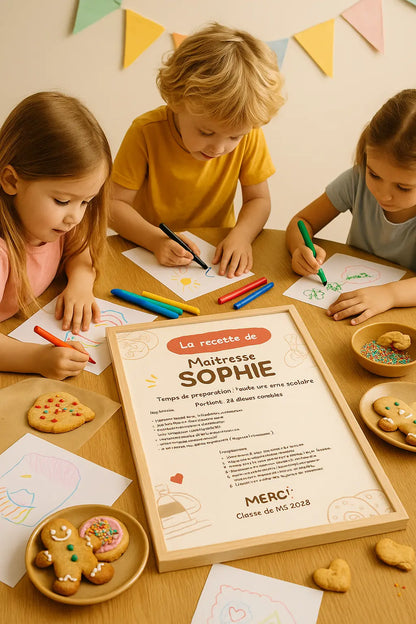 Le tout est personnalisé avec son prénom (ex : "Recette de Maîtresse Sophie") et peut être signé par les élèves ou les parents.