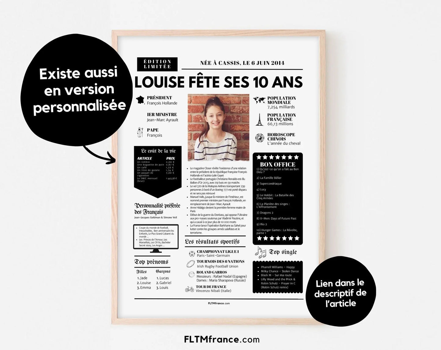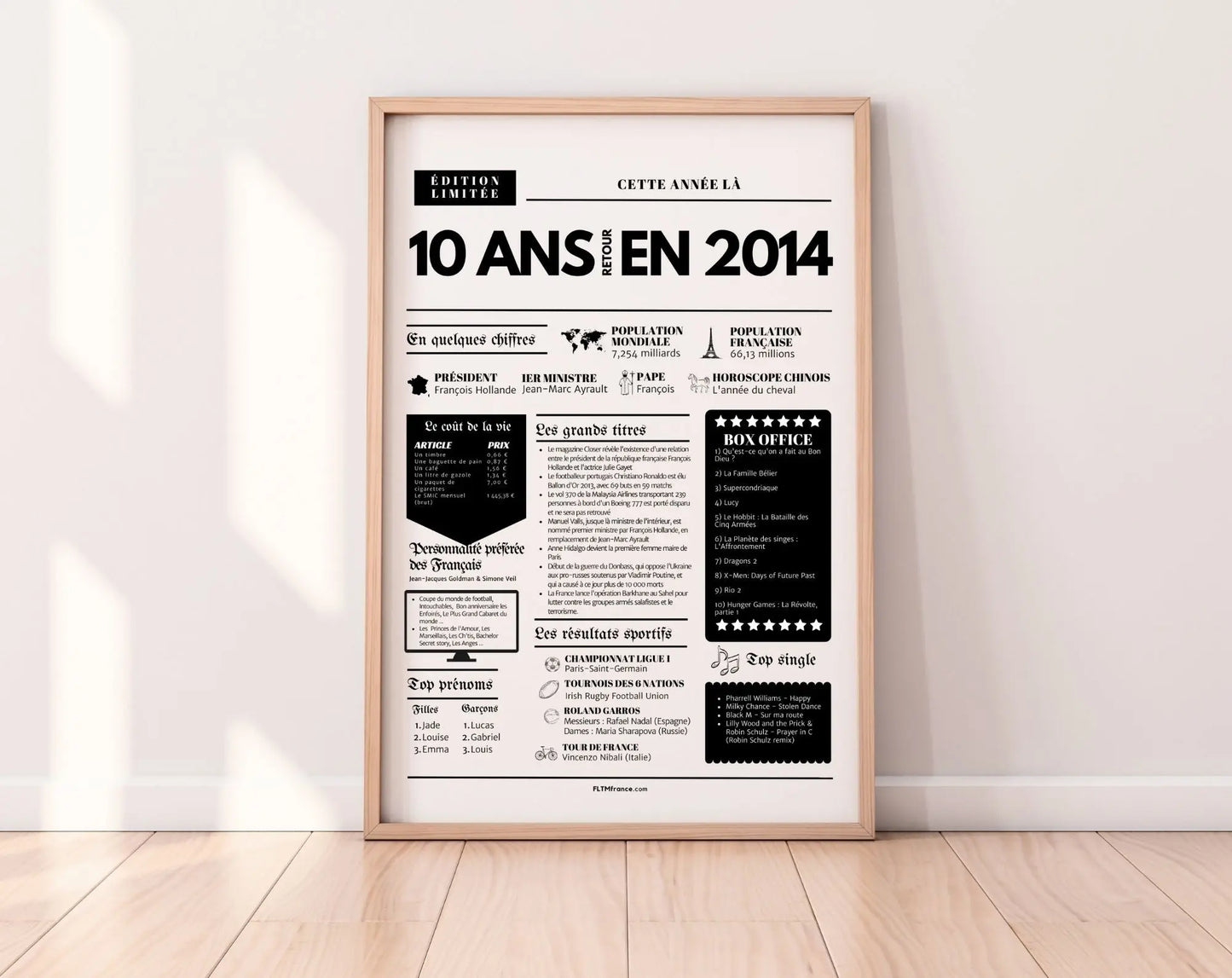 Découvrez notre affiche exclusive 2014 année de naissance - Carte anniversaire 10 ans, le cadeau parfait pour marquer le 10ème anniversaire d'un être cher. Conçue par FLTMfrance, cette affiche personnalisée est plus qu'un simple cadeau, c'est un trésor de souvenirs de 2014, capturant l'essence de cette année mémorable.