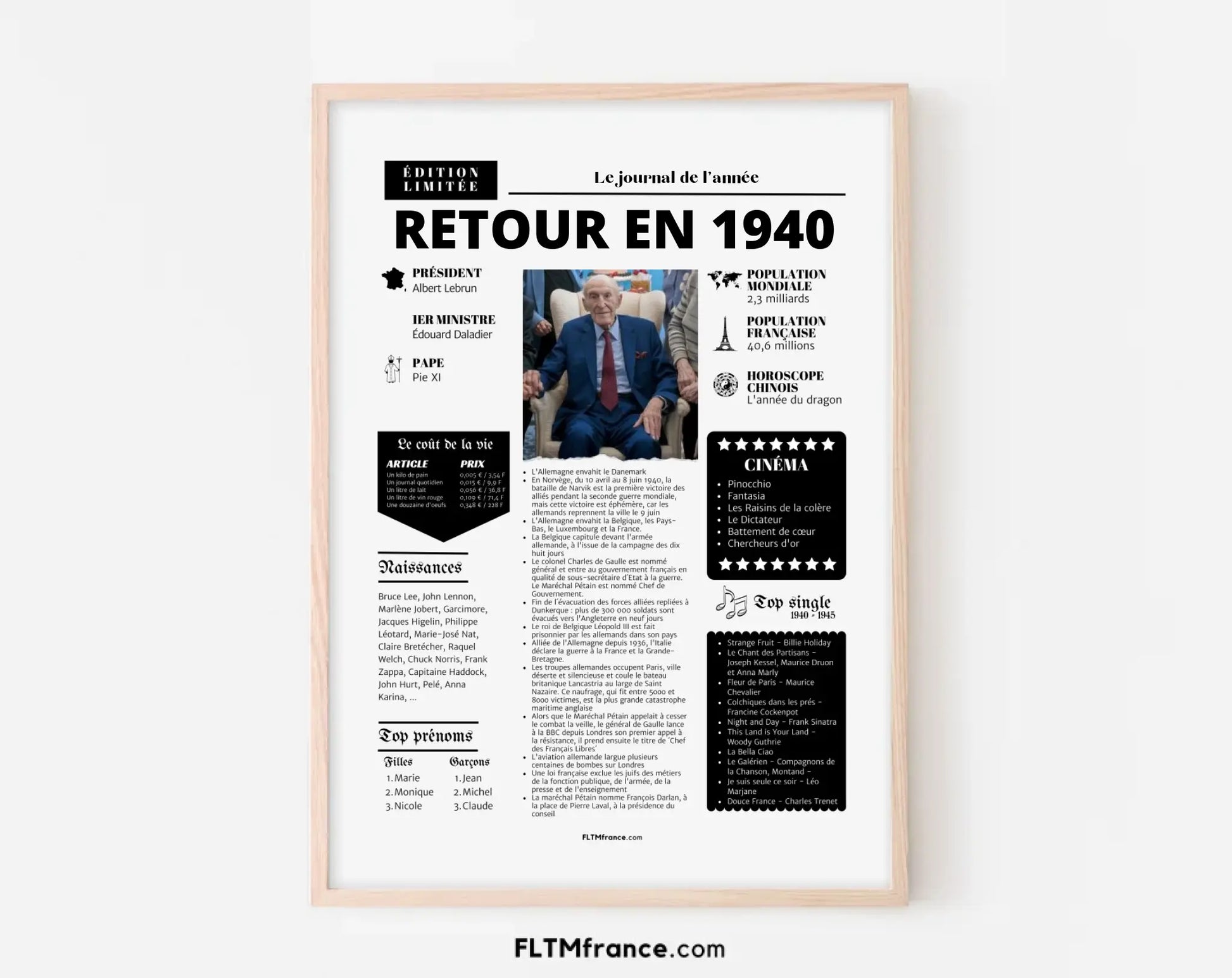 Affiche rétrospective année 1940 - Cadeau personnalisé 85 ans