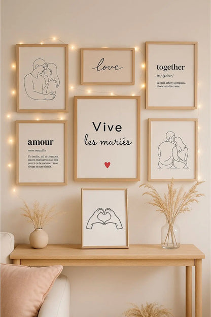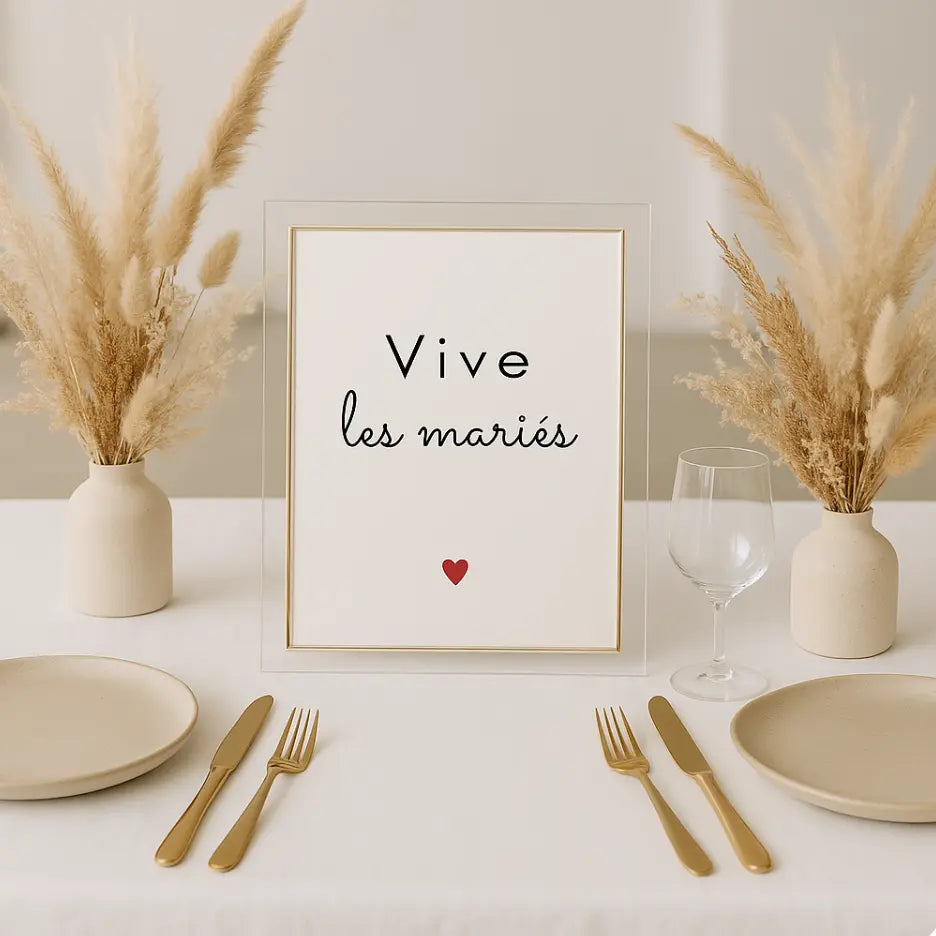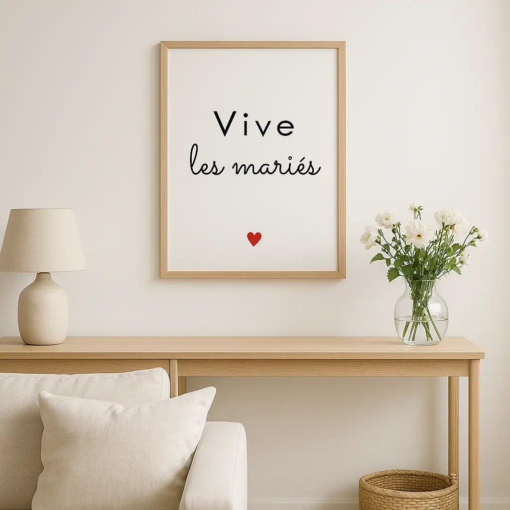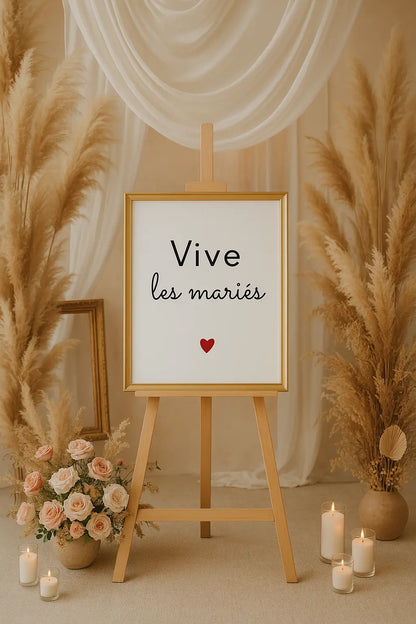 Célèbre l’amour avec élégance grâce à cette affiche "Vive les mariés", parfaite pour apporter une touche de douceur et de tendresse à un mariage. Minimaliste, chic et remplie d’amour, elle est idéale comme décoration de salle ou petit mot de félicitations à encadrer.