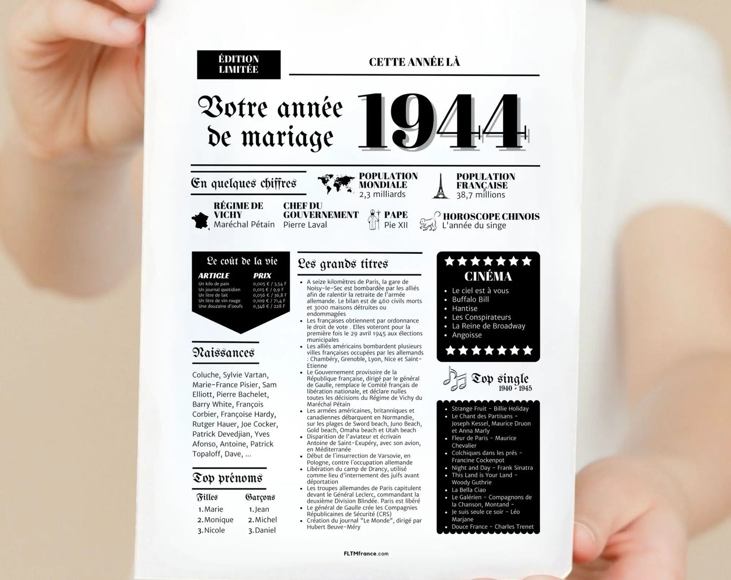 Affiche parfaite pour un 79eme anniversaire. Les details sur lannee 1944 ont rendu la fete encore plus memorable pour toute la famille. Tres satisfaite de mon achat !