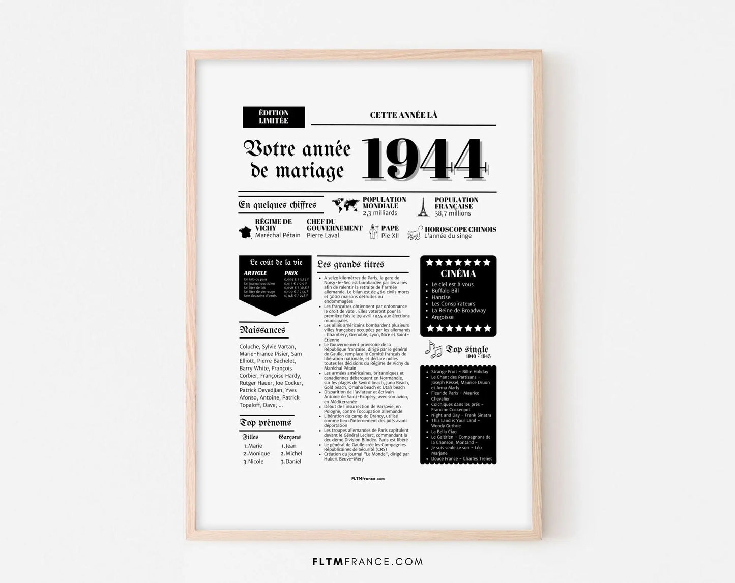 Célébrez un incroyable voyage de quatre-vingts ans ensemble avec notre affiche Année de mariage 1944 - Noces de chêne 🌳.