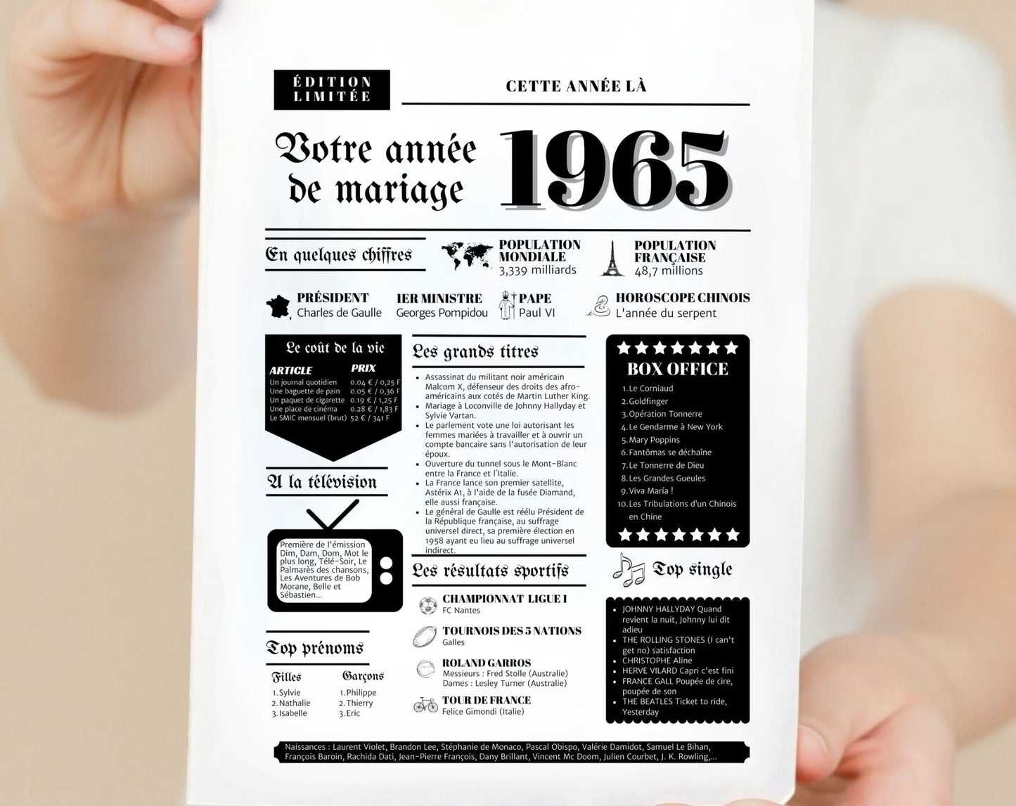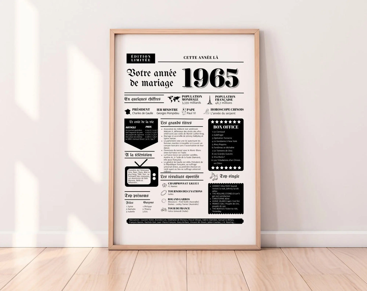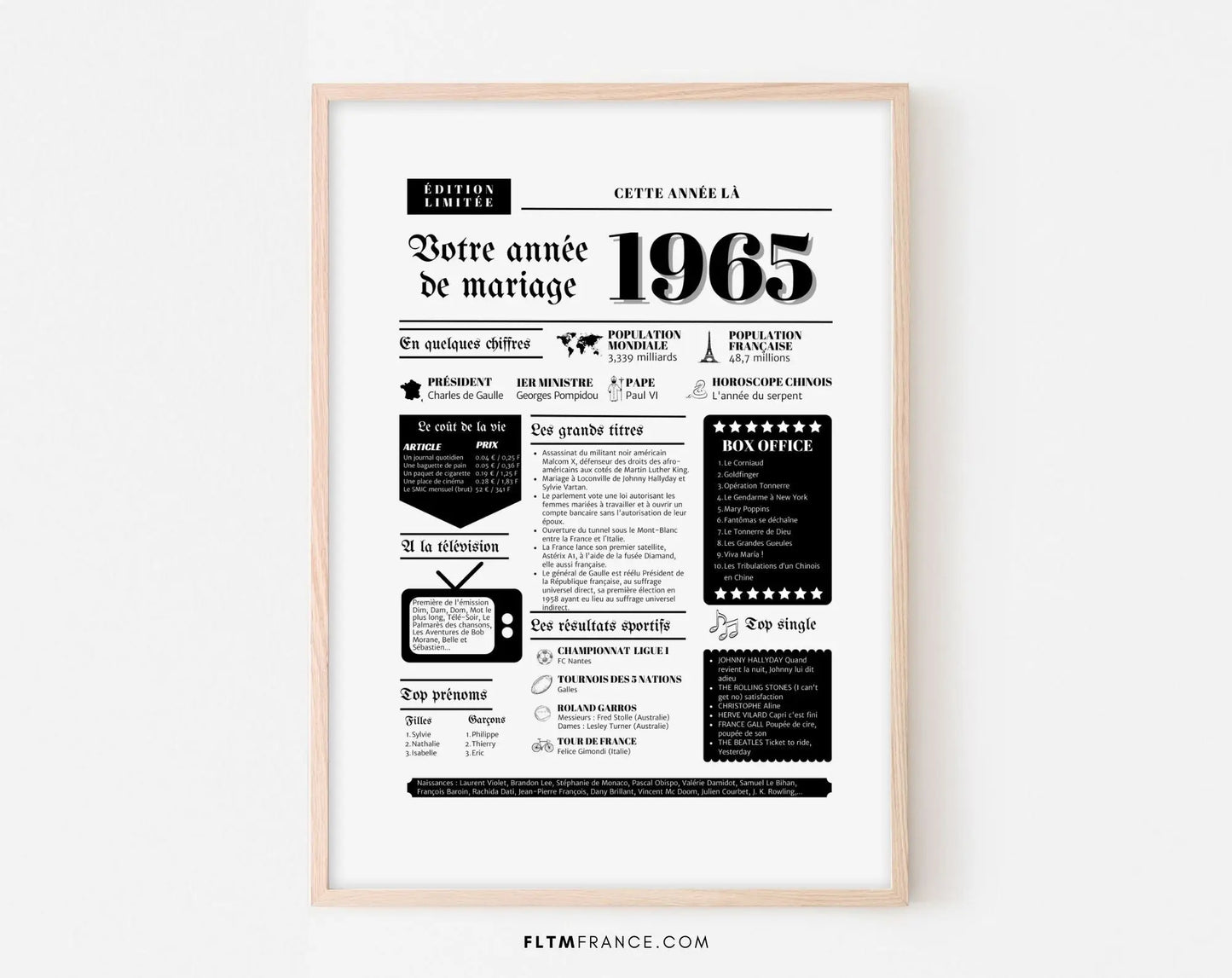 L'affiche numérique pour l'année de mariage 1965 est plus qu'un simple souvenir; c'est une pièce de décoration qui ajoute une touche de rétro à votre intérieur. Elle s'intègre parfaitement dans les thèmes vintage ou contemporains, apportant une dimension historique et personnelle à votre espace.