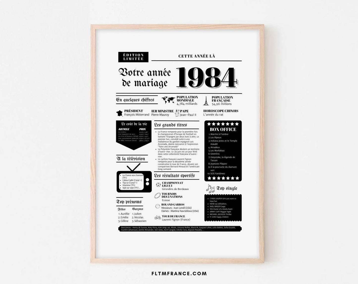 Plongez dans l'année mémorable de 1984 : Cette affiche est une invitation à revivre les moments forts de 1984, une année significative dans votre histoire d'amour. Elle ajoute une note de nostalgie et de personnalisation à votre célébration d'anniversaire. 🕰️✨