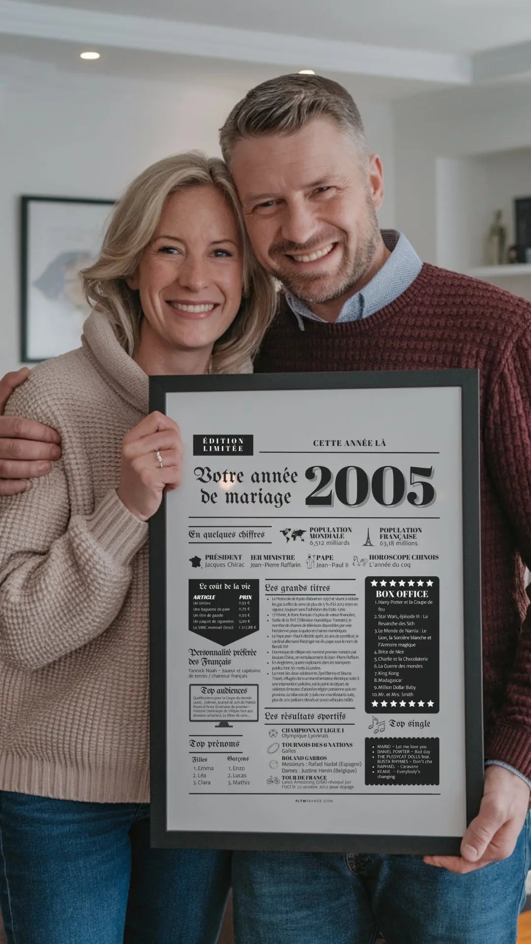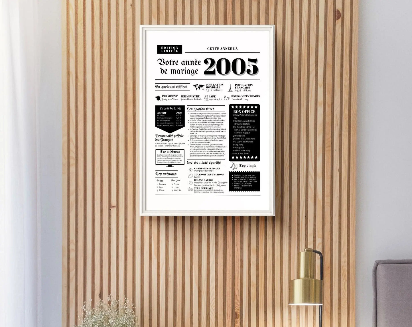 Plongez dans l'année 2005 avec notre affiche année de mariage 2005. Cette affiche à imprimer est idéale pour célébrer un moment spécial et apporter une touche nostalgique à votre décoration intérieure. Que ce soit pour revivre votre mariage ou pour offrir un cadeau mémorable à un couple, cette affiche est une œuvre d'art intemporelle.