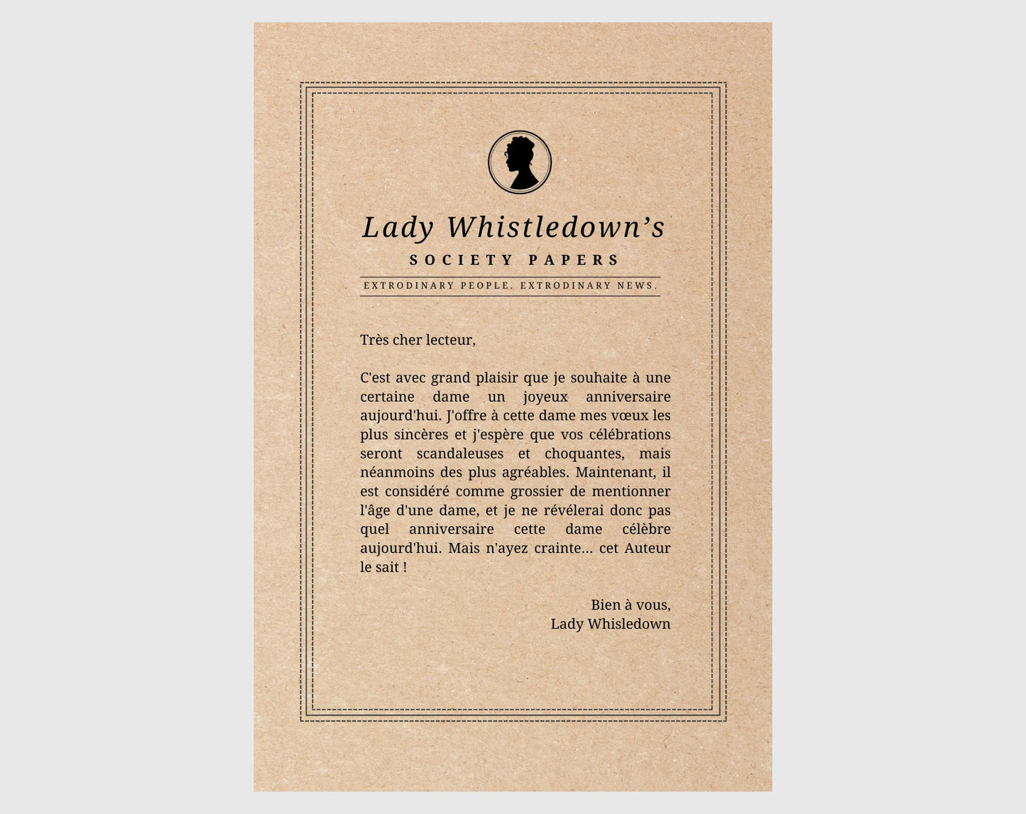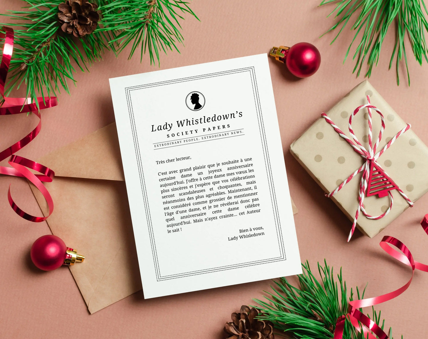 Carte anniversaire femme Lady Whistledown inspiré de la série Bridgerton