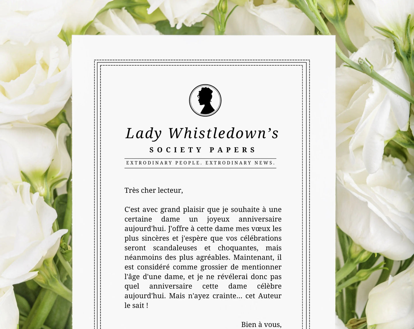 Plongez dans l'univers raffiné et élégant de la série Bridgerton avec notre carte anniversaire femme inspirée de Lady Whistledown. Conçue spécialement pour les fans de cette série à succès, cette carte numérique est un hommage à l'époque Regency, mêlant charme et sophistication. Parfaite pour les amateurs de la série, elle apportera une touche d'originalité et de distinction à vos souhaits d'anniversaire.