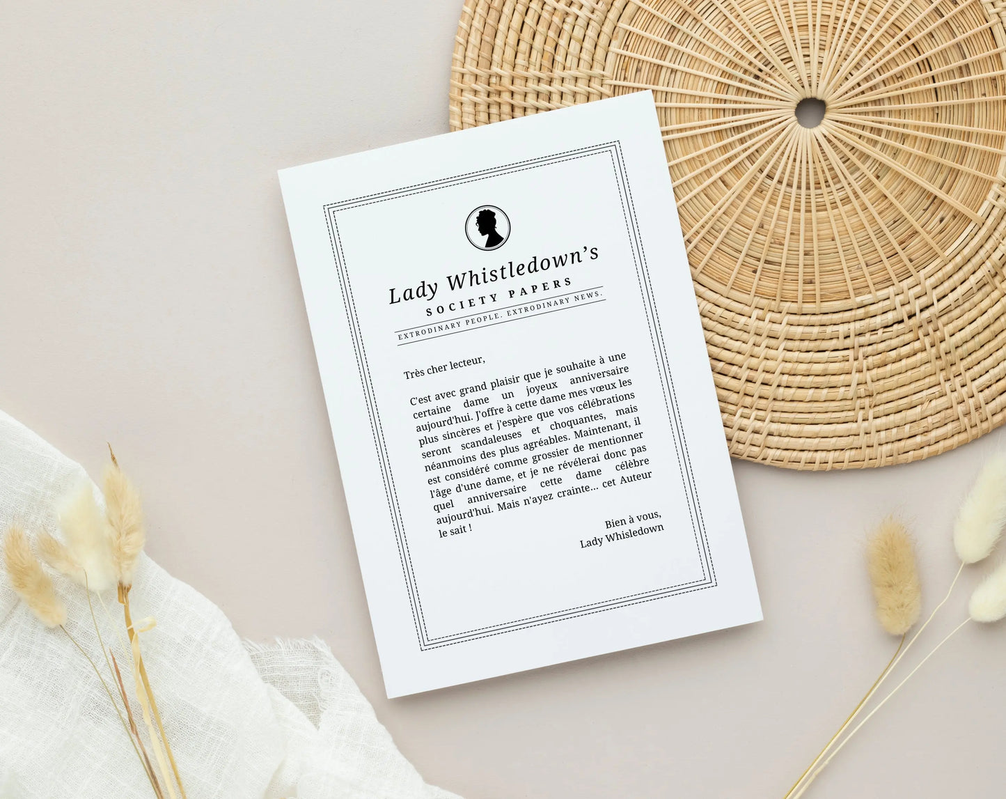 Opter pour notre carte anniversaire femme inspirée de Lady Whistledown, c'est choisir l'originalité et l'élégance. Chaque carte est conçue avec soin pour refléter l'univers de Bridgerton, offrant une expérience unique à la personne qui la reçoit. Cette carte anniversaire est parfaite pour ceux qui cherchent à sortir des sentiers battus et à offrir quelque chose de véritablement spécial. En plus de son esthétique soignée, elle offre la praticité d'une carte numérique, pouvant être téléchargée et imprimée en quelques clics.