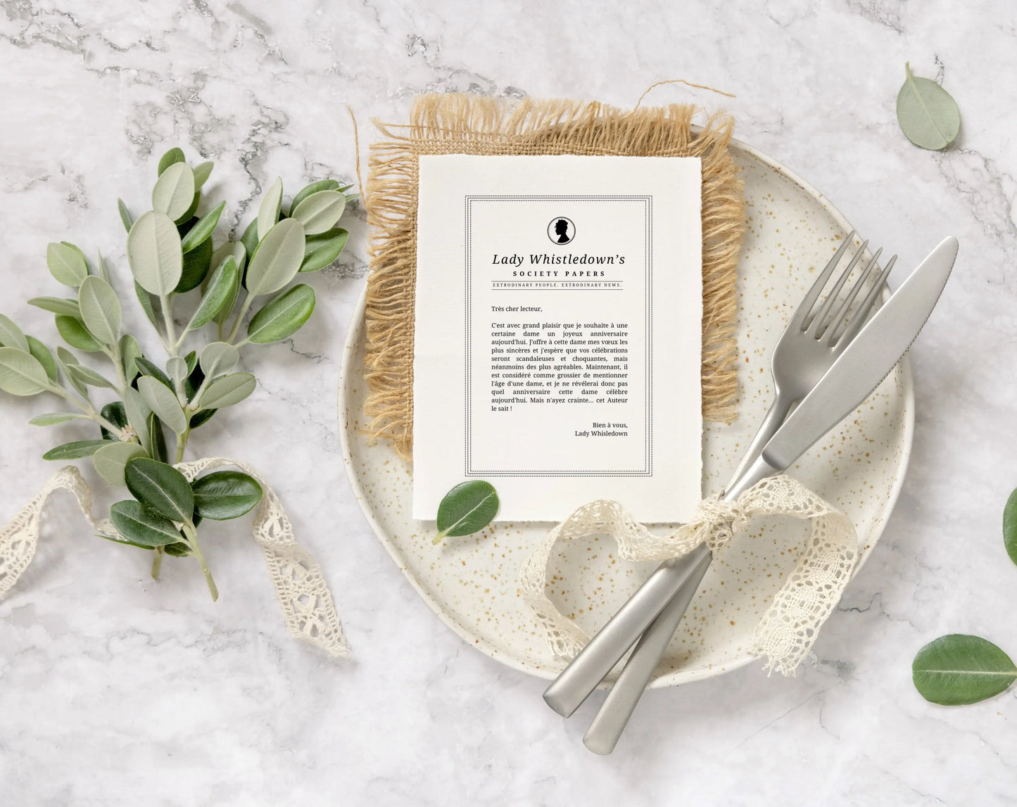 Une carte inspirée de Bridgerton, parfaite pour une fête d'anniversaire chic et pleine de charme.
