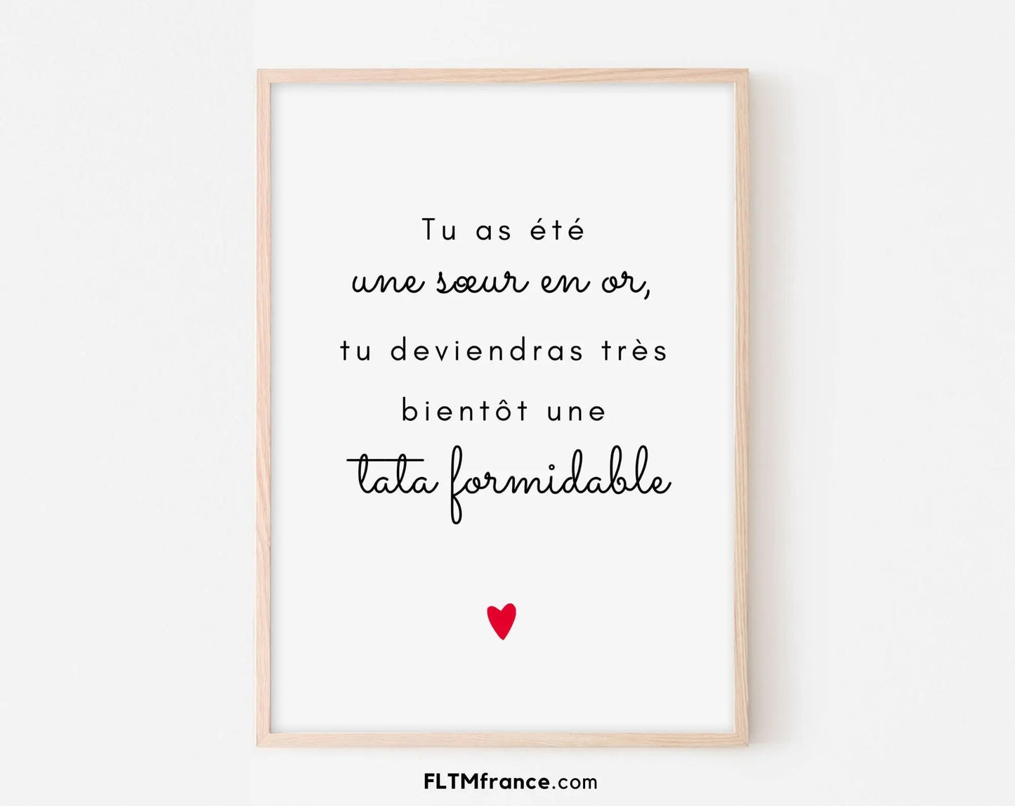 Cette affiche, destinée à une future tante, porte le message touchant : Tu as été une sœur en or, tu deviendras une tata formidable. C'est une façon unique et significative de révéler une grossesse à sa sœur, en lui faisant part de l'importance qu'elle a dans votre vie et de la joie anticipée de la voir dans son nouveau rôle de tata.