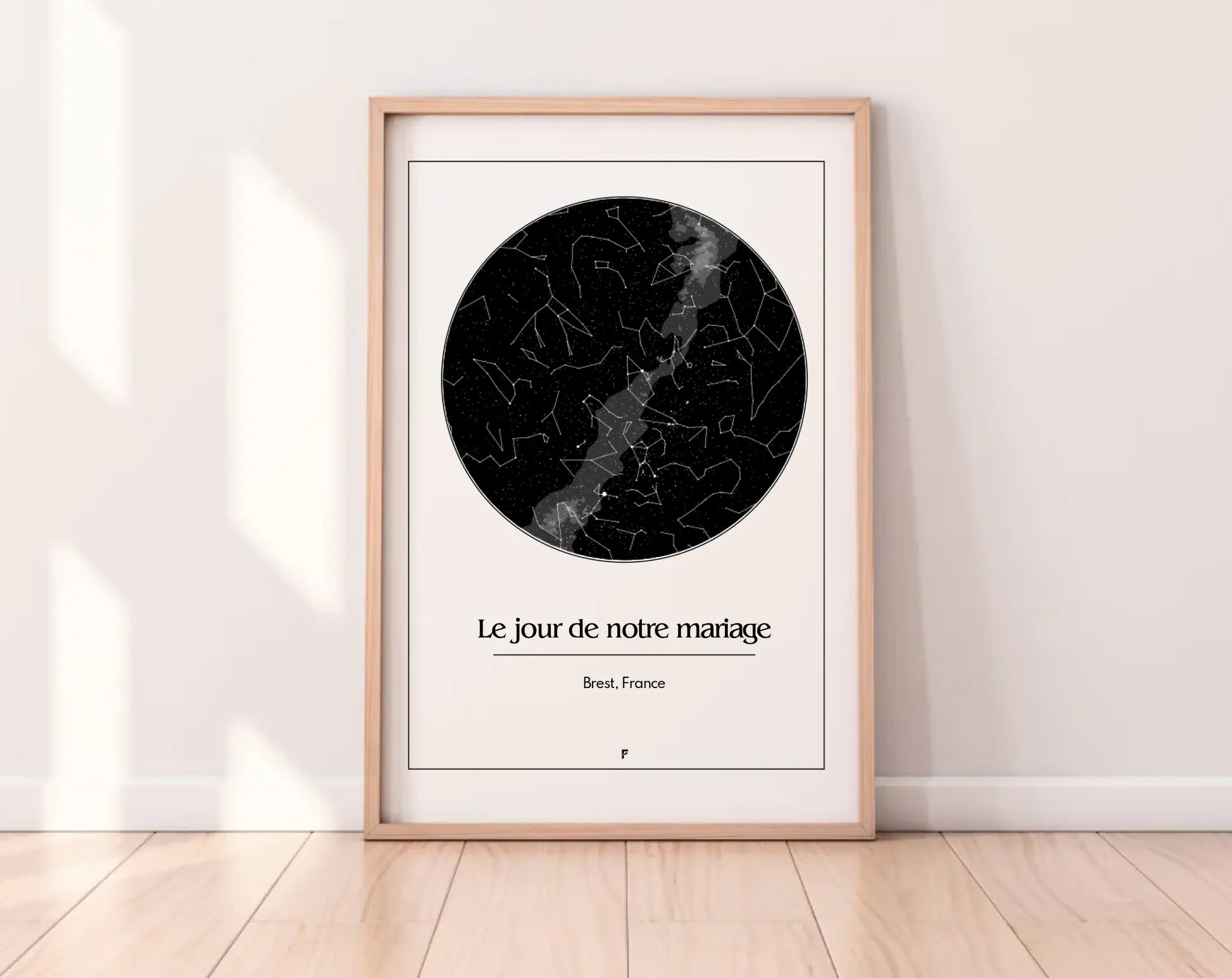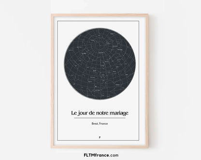 Immortalisez le plus beau jour de votre vie avec une affiche personnalisée du ciel étoilé, telle qu’il était le jour et à l’endroit de votre mariage. Un cadeau romantique, symbolique et intemporel, parfait pour célébrer l’amour.