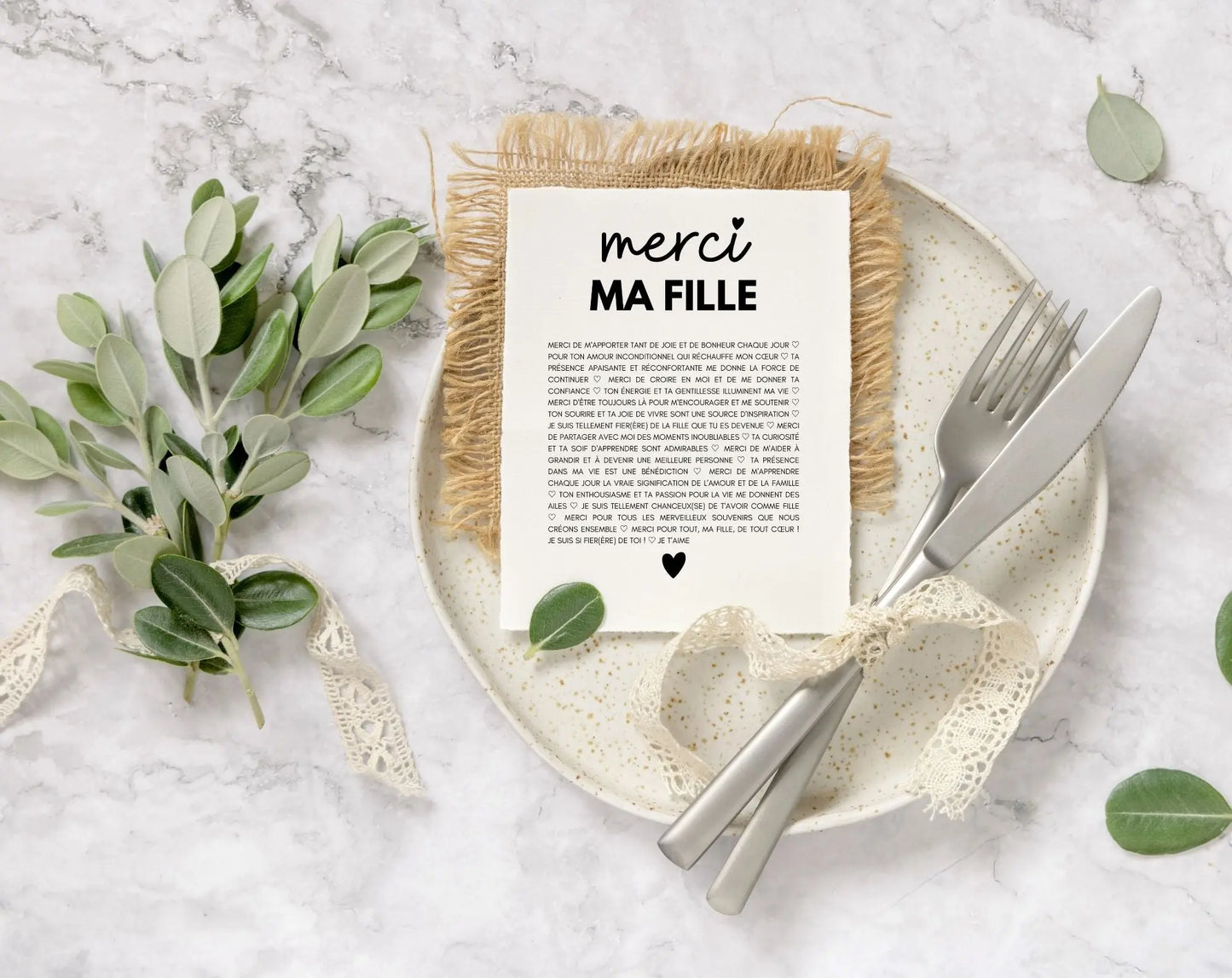 En choisissant notre carte "merci ma fille", vous optez pour un moyen élégant et personnalisé d'exprimer votre gratitude. Téléchargez-la dès aujourd'hui et commencez à créer un souvenir inoubliable pour votre fille.
