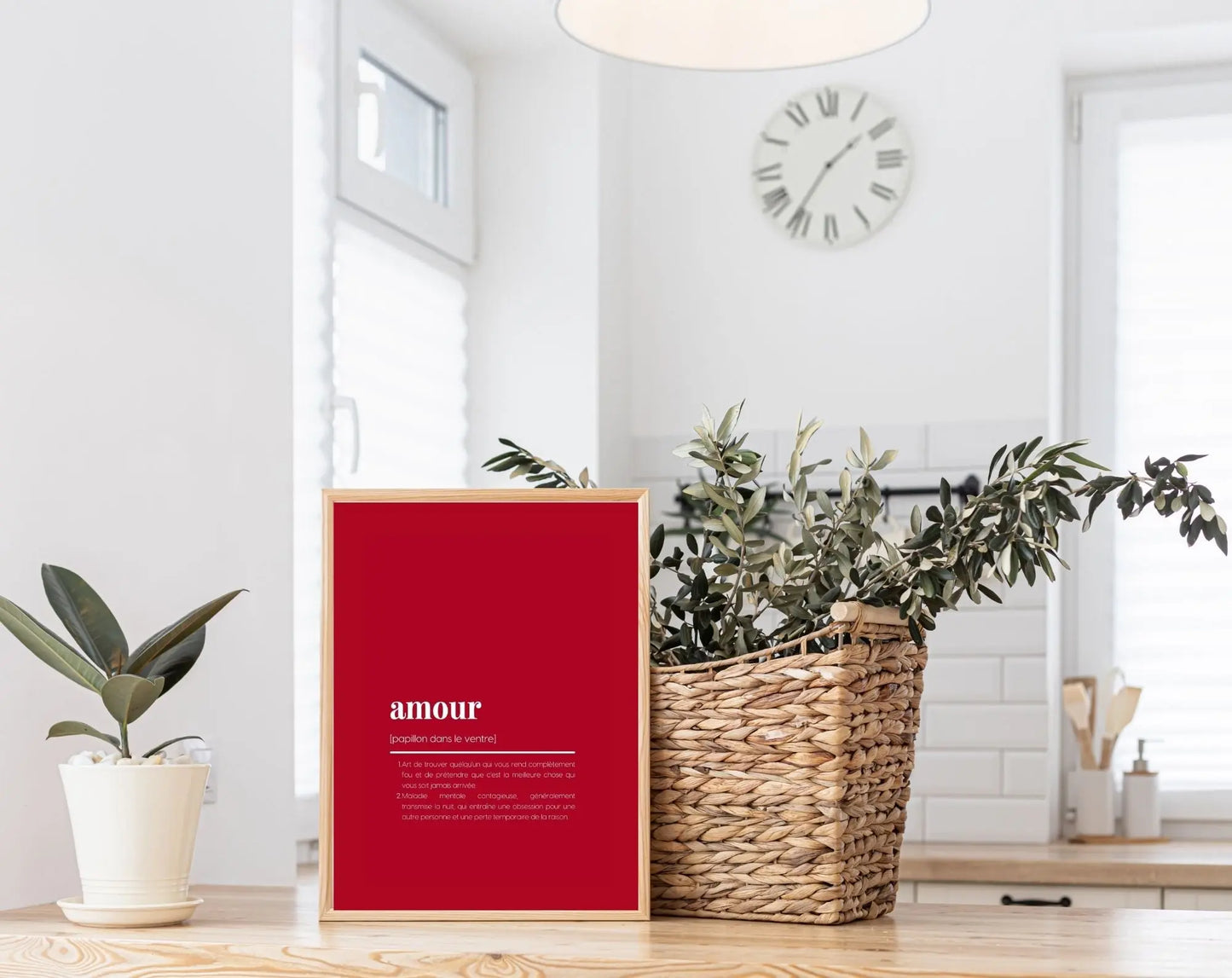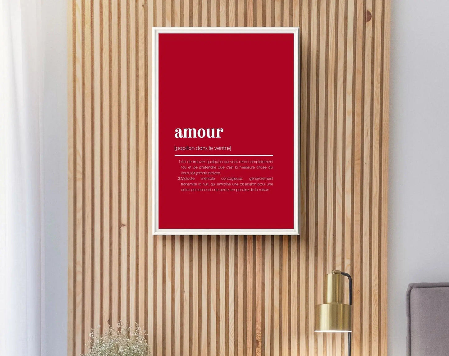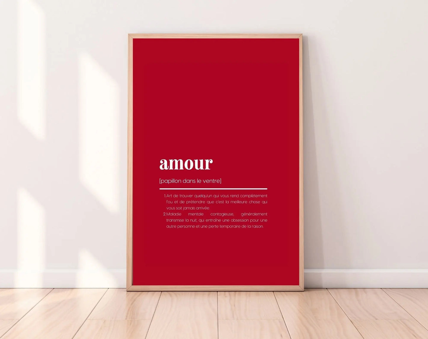 Découvrez notre affiche humoristique définition amour, une pièce de décoration murale parfaite pour célébrer la Saint-Valentin avec une touche d'espièglerie.