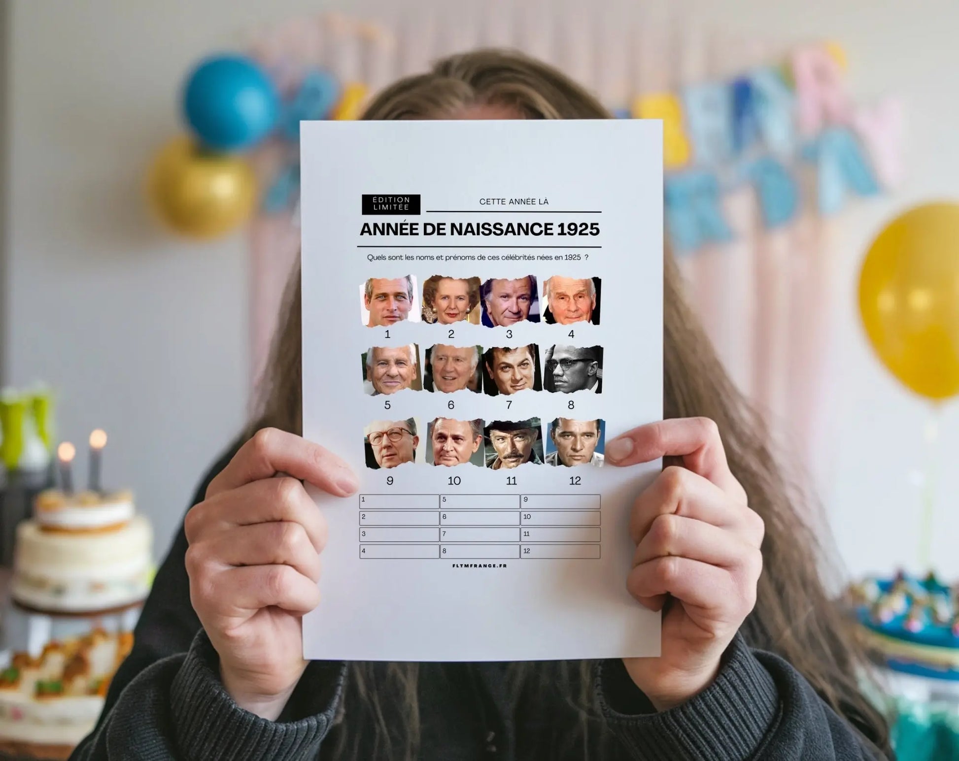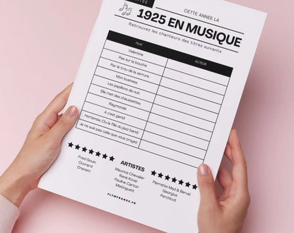 Pour célébrer un 100e anniversaire de manière inoubliable, notre jeu anniversaire 100 ans à imprimer est l’animation idéale. Téléchargez-le dès maintenant surFLTMfrance.com et profitez d’un jeu facile à organiser, qui saura divertir vos invités et créer des moments mémorables. Grâce à cette animation prête à l’emploi, vous pourrez profiter pleinement de la fête tout en garantissant des moments de rires, de partage et d’émotion, marquant ainsi un siècle de vie rempli de souvenirs.