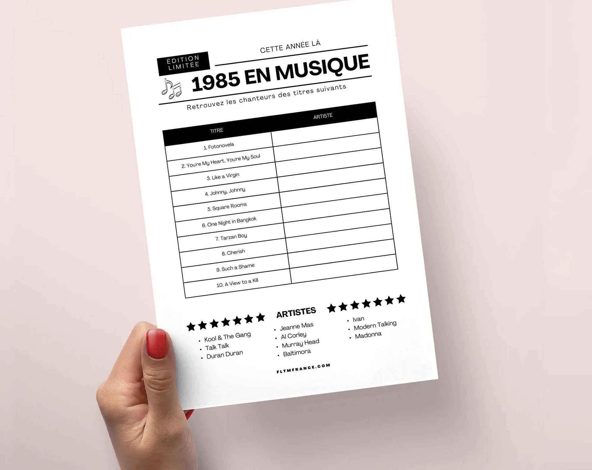 La clé pour réussir l’organisation d’un anniversaire de 40 ans est de bien planifier les animations. Grâce à notre jeu anniversaire 40 ans à imprimer, vous avez une solution clés en main, prête à être utilisée. Pas de stress, tout est déjà pensé pour vous. Téléchargez, imprimez et c’est parti !