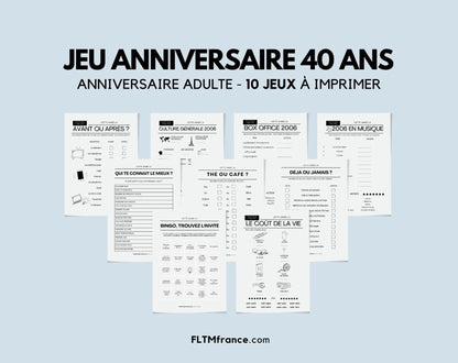 Organiser un jeu pour un anniversaire de 40 ans peut vite devenir un casse-tête si vous devez tout prévoir de A à Z. C’est pourquoi nous avons pensé à tout pour vous faciliter la tâche. En quelques clics, vous téléchargez directement le jeu sur notre site fltmfrance.com et vous êtes prêt à l'imprimer et l’utiliser immédiatement. Vous n’aurez pas besoin de passer des heures à chercher des idées, notre pack de jeu est complet, détaillé et adaptable à tous types de fêtes.