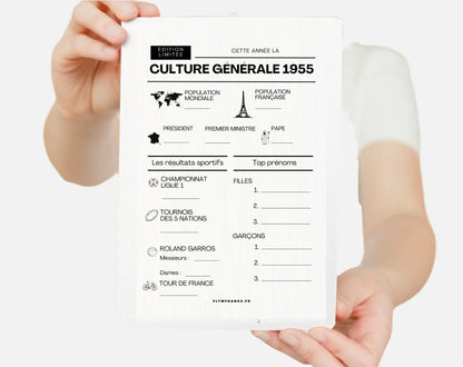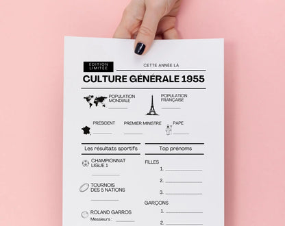 Le jeu anniversaire année 1955 est l’animation parfaite pour fêter un 70e anniversaire avec originalité et nostalgie. Téléchargez ce pack dès maintenant et replongez vos invités dans les souvenirs de 1955 tout en passant un moment chaleureux et divertissant.