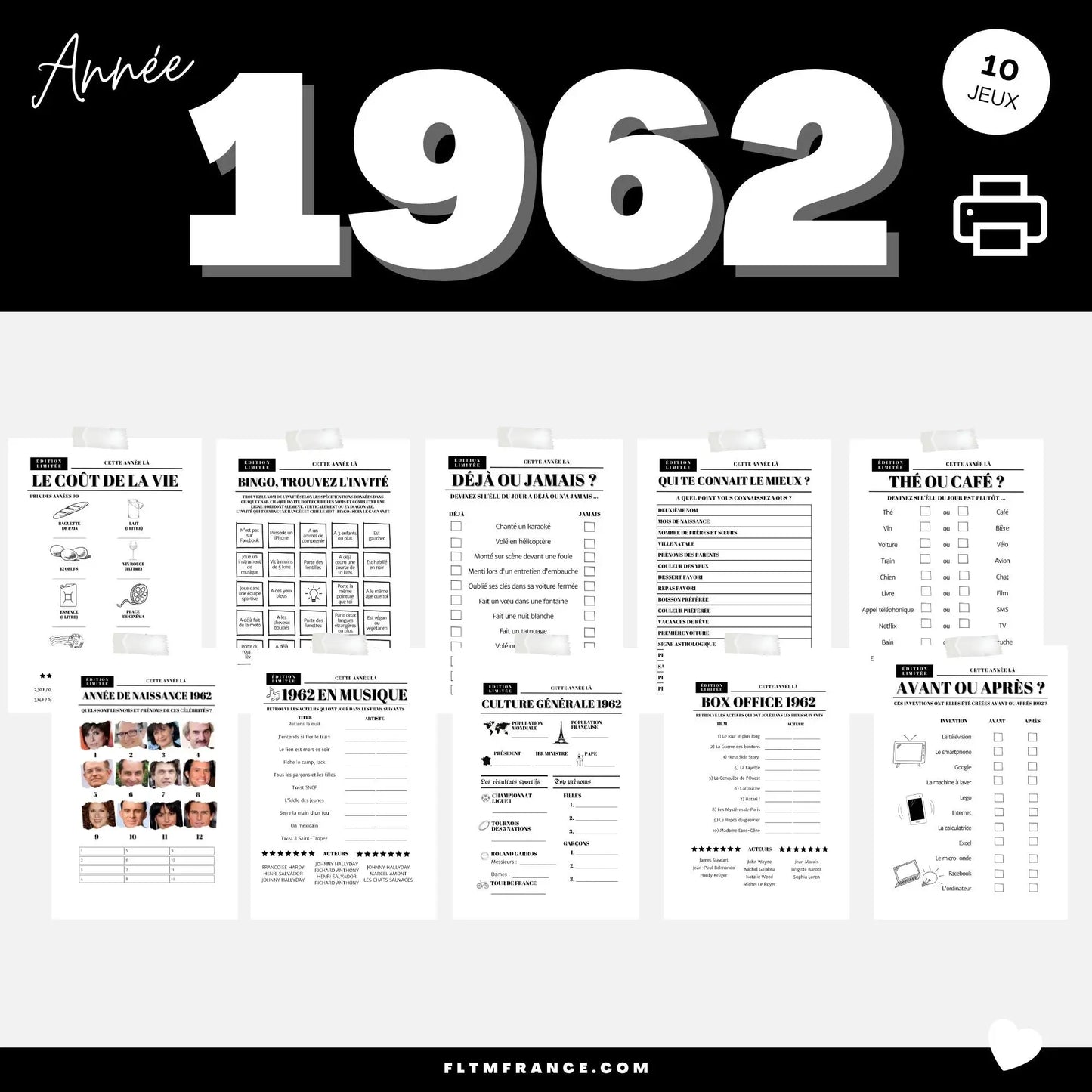 Voici un aperçu des jeux que vous trouverez dans notre jeu anniversaire Année 1962 à imprimer :