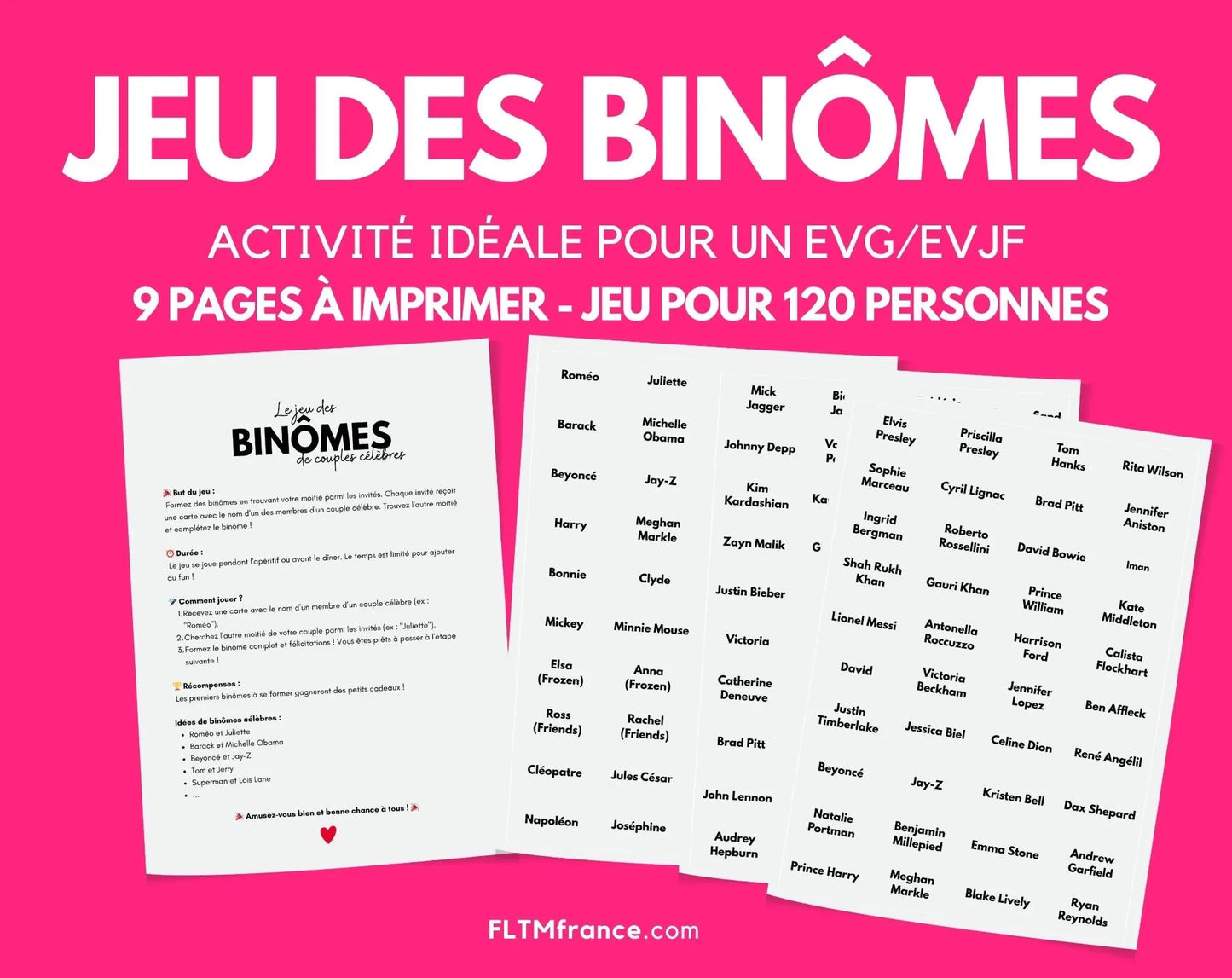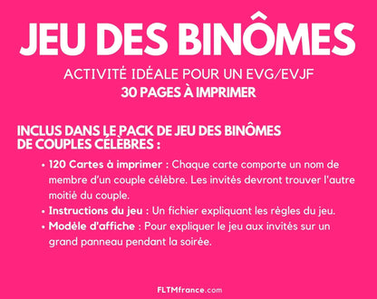 Jeu des binômes de couples célèbres – Spécial EVG et EVJF à imprimer