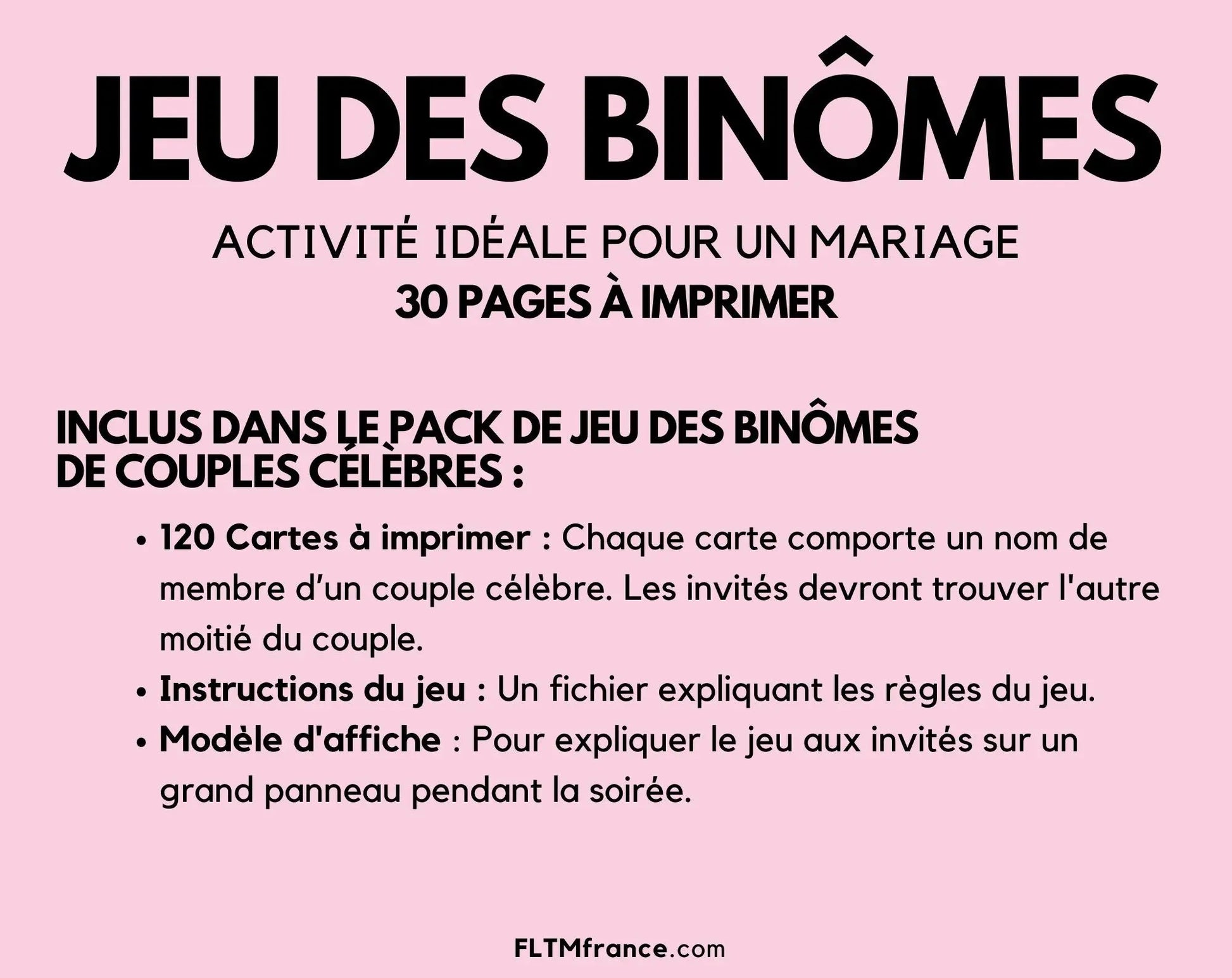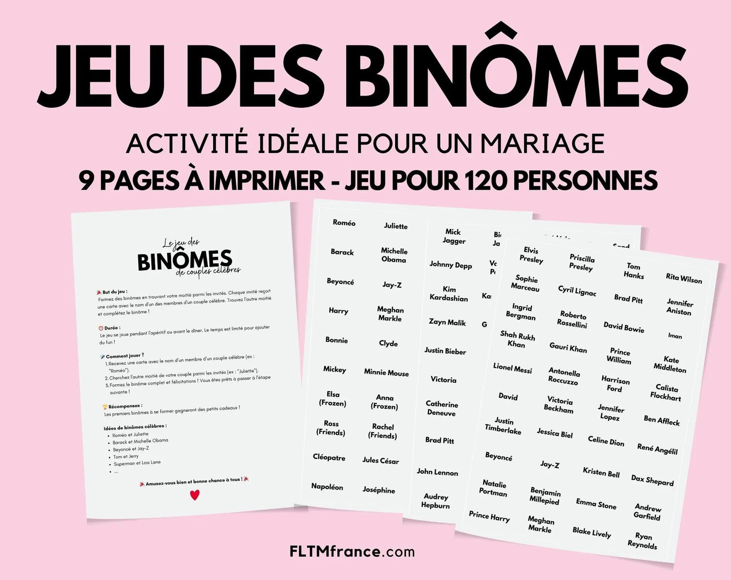 💍 Jeu des binômes de couples célèbres – Animation mariage à imprimer