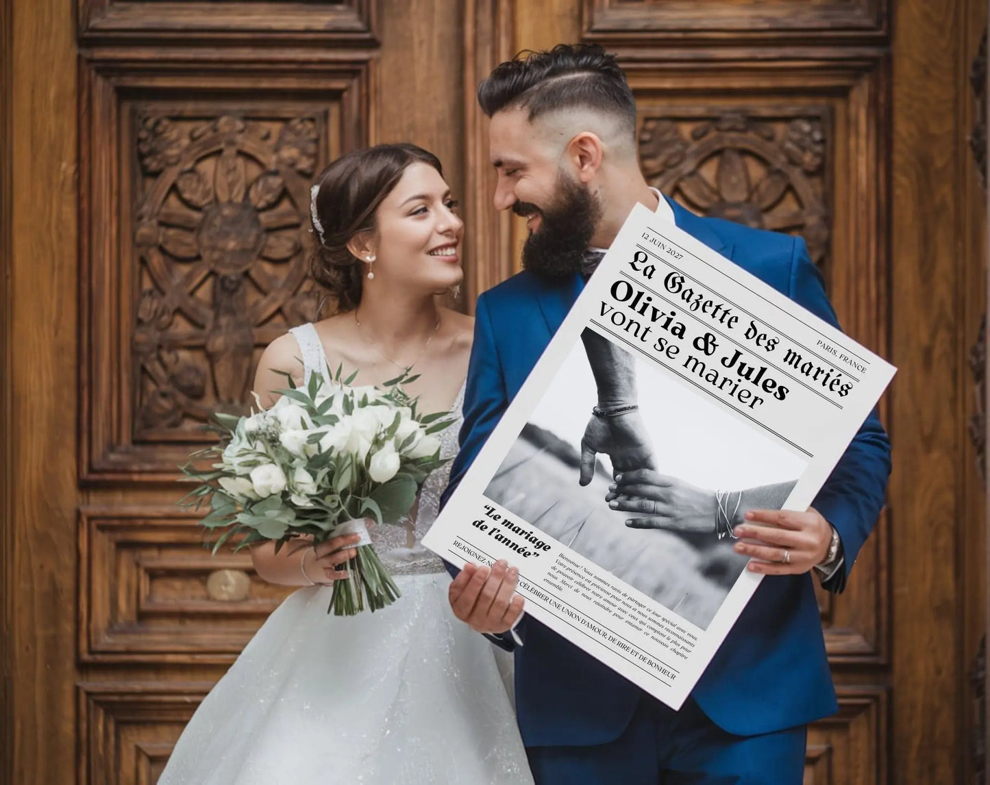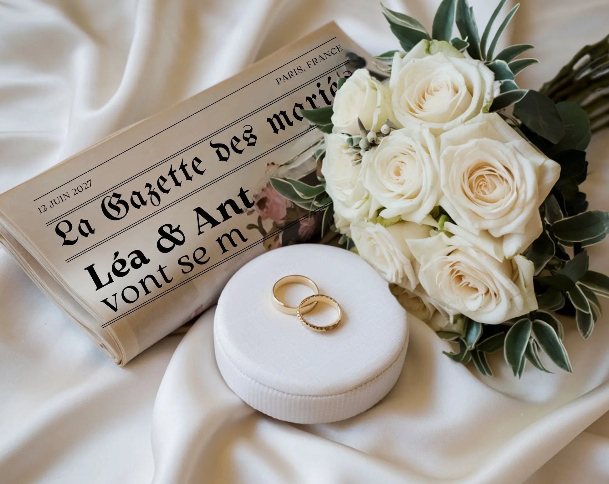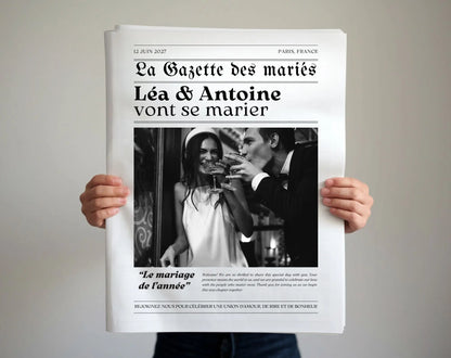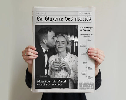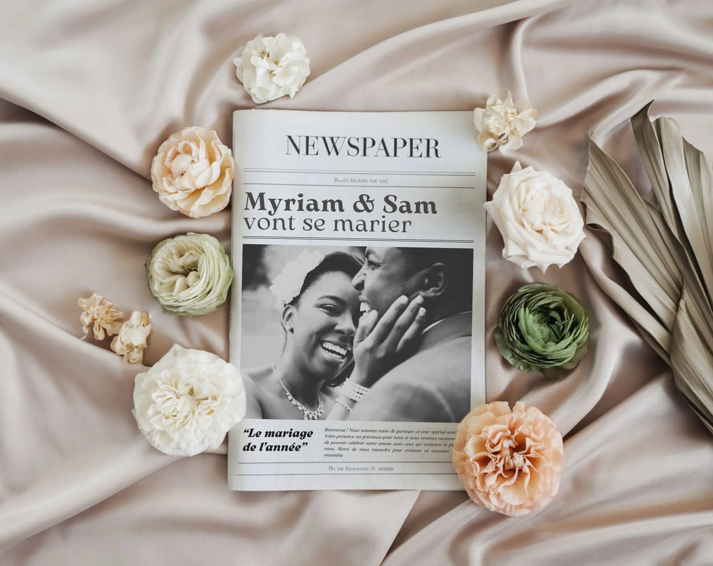 La Gazette des Mariés à personnaliser et imprimer soi-même – Journal de mariage unique à télécharger (4 pages, formats A3, A4, A5)