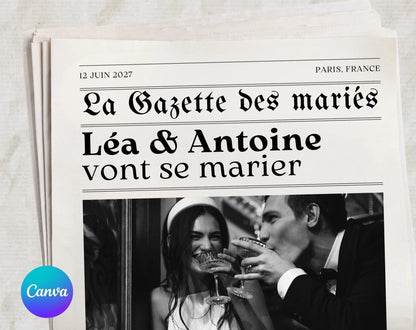 Surprends tes invités avec La Gazette des Mariés, un journal de mariage original, drôle et émouvant à personnaliser facilement en ligne ! Ce modèle 100 % numérique est composé de 4 pages modifiables avec Canva, prêtes à être adaptées à ton couple et à ton histoire. Idéal pour ajouter une touche personnelle et mémorable à ton grand jour.