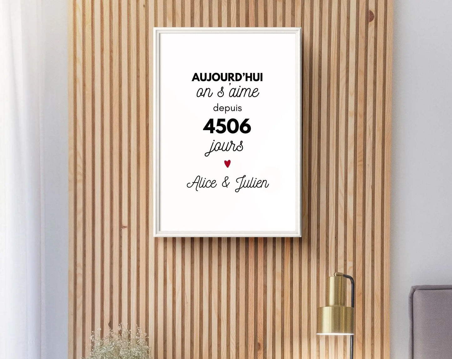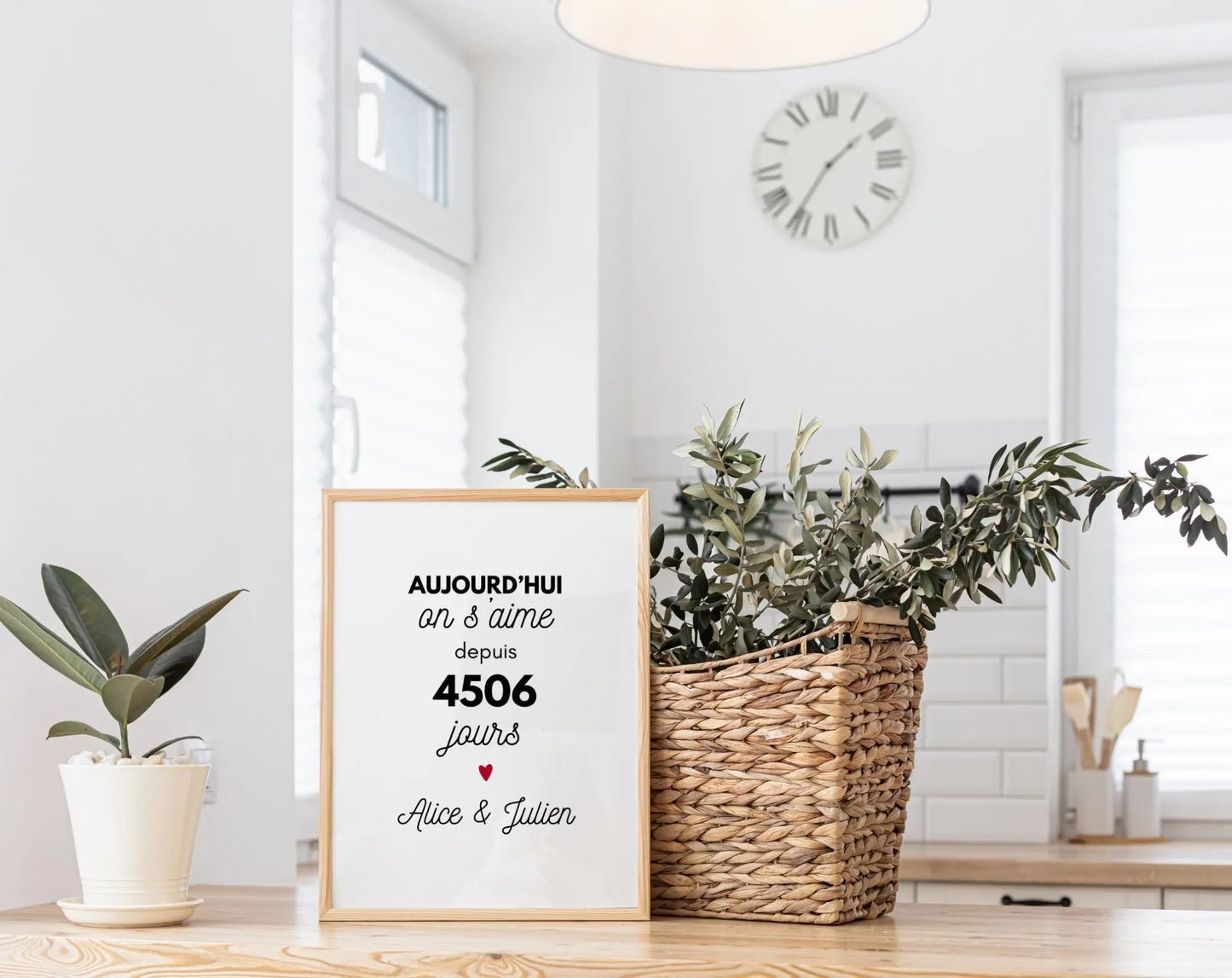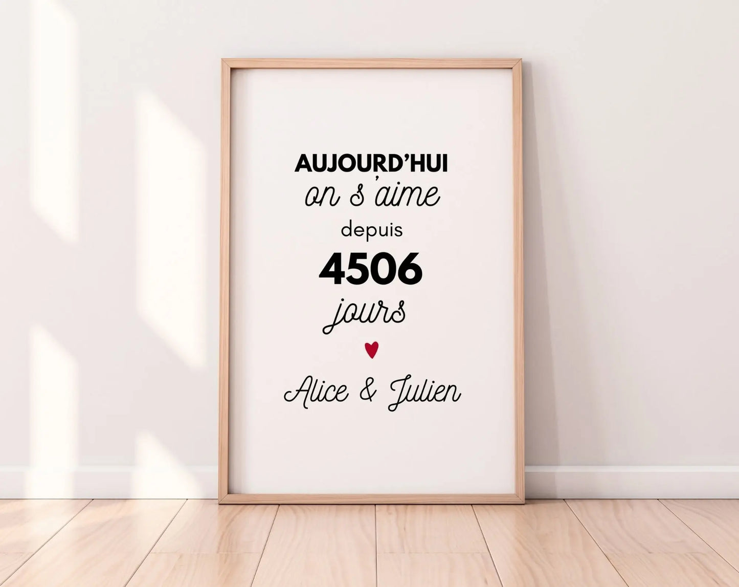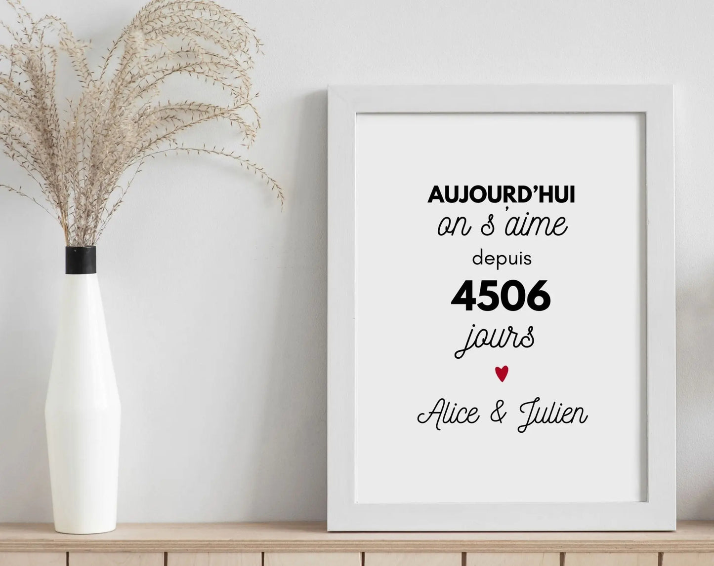 On s’aime depuis... jours Affiche personnalisée couple avec prénoms et date anniversaire