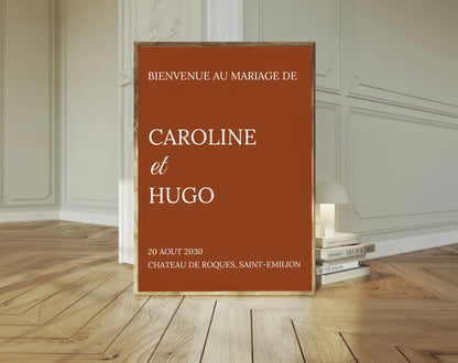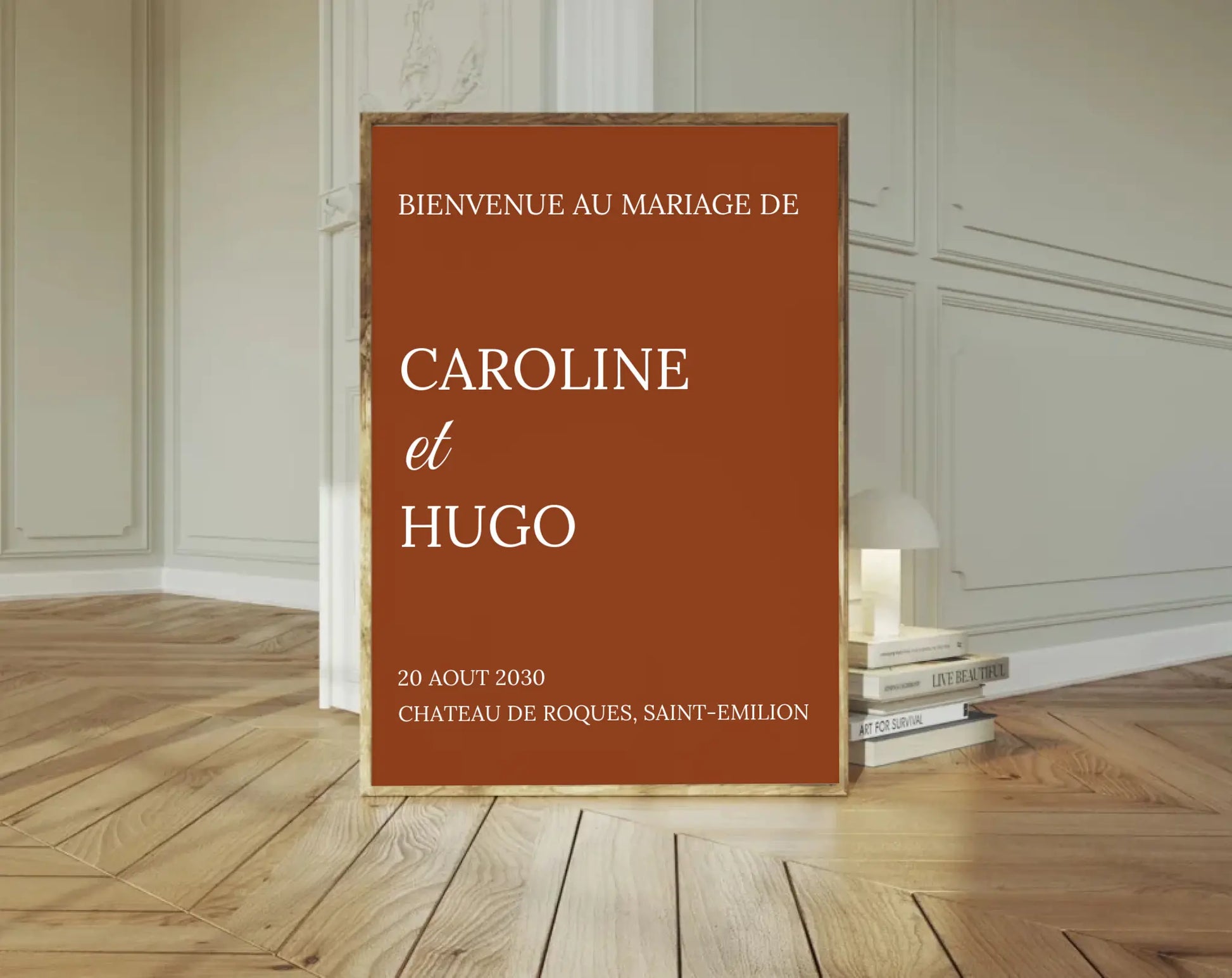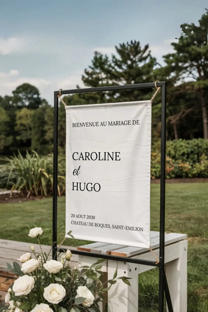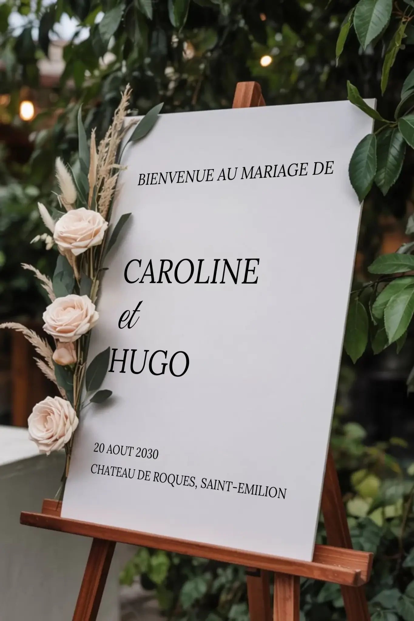 Ajoutez vos prénoms, la date du mariage, une citation romantique, ou un message d’accueil original. Certains modèles permettent aussi d’ajouter des illustrations florales, un motif graphique.