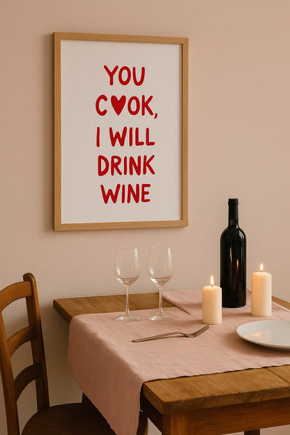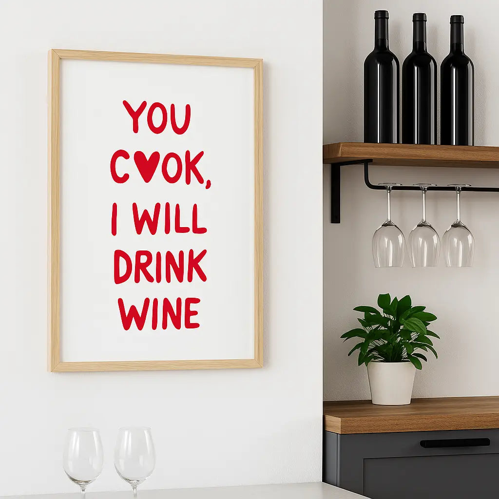 Envie d’ajouter une touche d’humour dans ta cuisine ? Ce poster “You cook, I will drink wine” est l’accessoire déco parfait pour faire sourire tout en décorant avec style. Un clin d’œil décalé à nos talents (ou non) culinaires, qui trouvera sa place dans toutes les cuisines modernes ou dans un coin bar 🍷